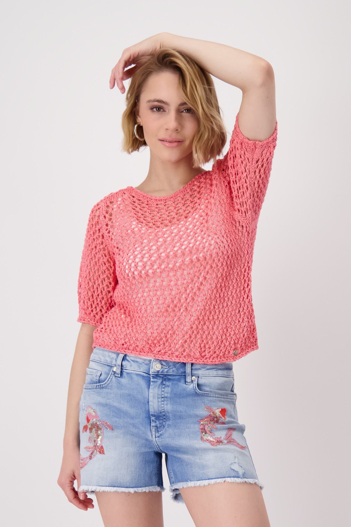 Schau dir den Strickpullover von Monari mal genauer an. Die halblangen Raglanärmel haben eine schräg verlaufende Naht bis hoch zum Halsausschnitt, die die Schulterpartie umfasst und somit viel Bewegungsspielraum lässt. Sie enden in einer Strickkante. Dieser Pullover hat einen U-Boot-Ausschnitt mit Strickbund und ist kurz sowie basic geschnitten, sodass dein Oberkörper dezent in Szene gesetzt wird.