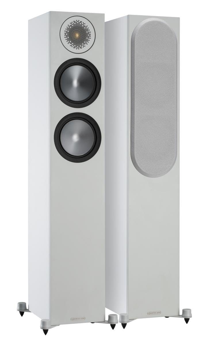 Die Monitor Audio Bronze 200 Standlautsprecher (6. Generation) in Weiß mit grauer Frontseite vereinen elegantes Design mit audiophilem Klang und liefern im Paar ein beeindruckendes Hörerlebnis.