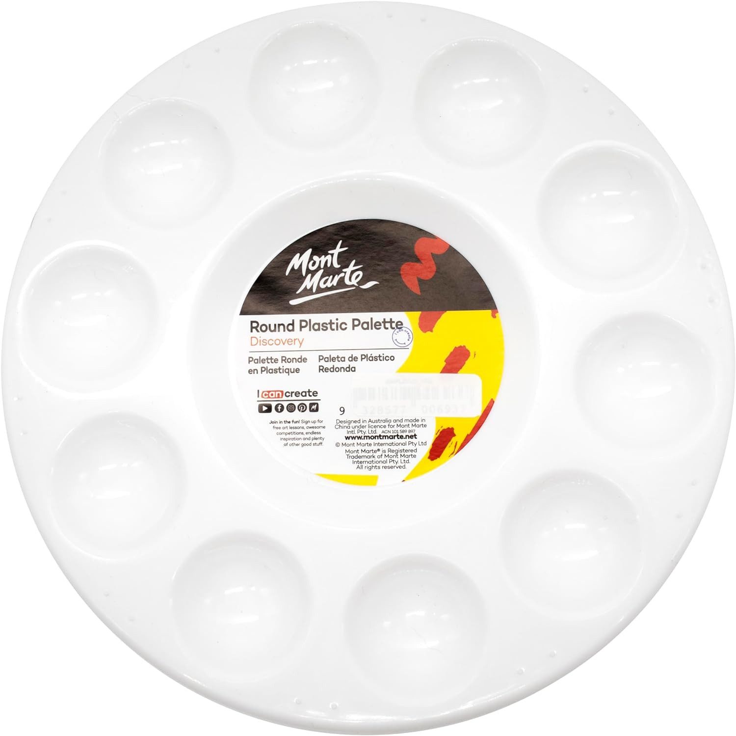 Die stabile Kunststoff Mischpalette von Mont Marte besitzt zehn kleine Vertiefungen zum Mischen und eine große zentrale Vertiefung zum Verdünnen von Farben.