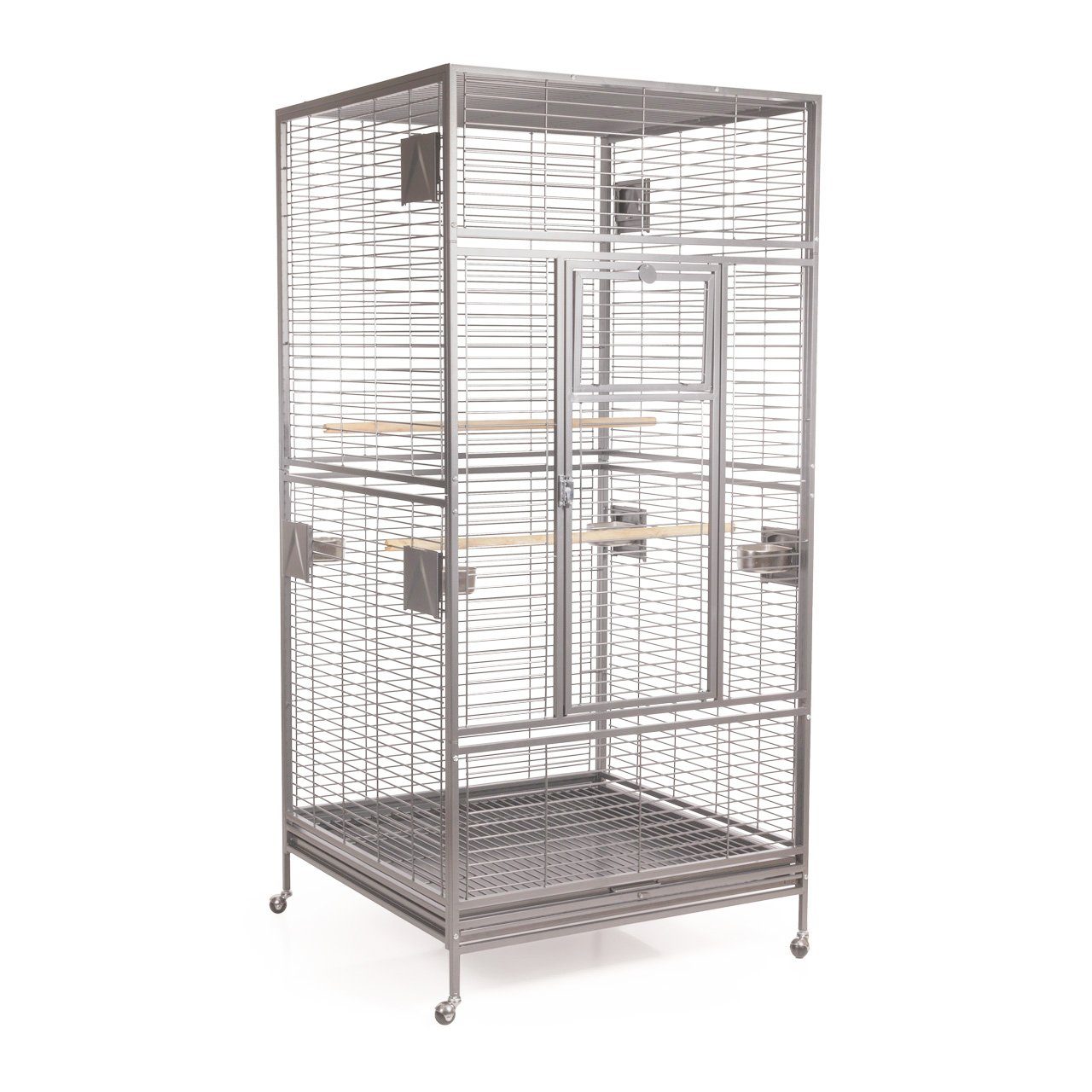Mobil durch stabile Rollenfüße, Sitzstangen und Edelstahlnäpfe ebenfalls im Lieferumfang enthalten.