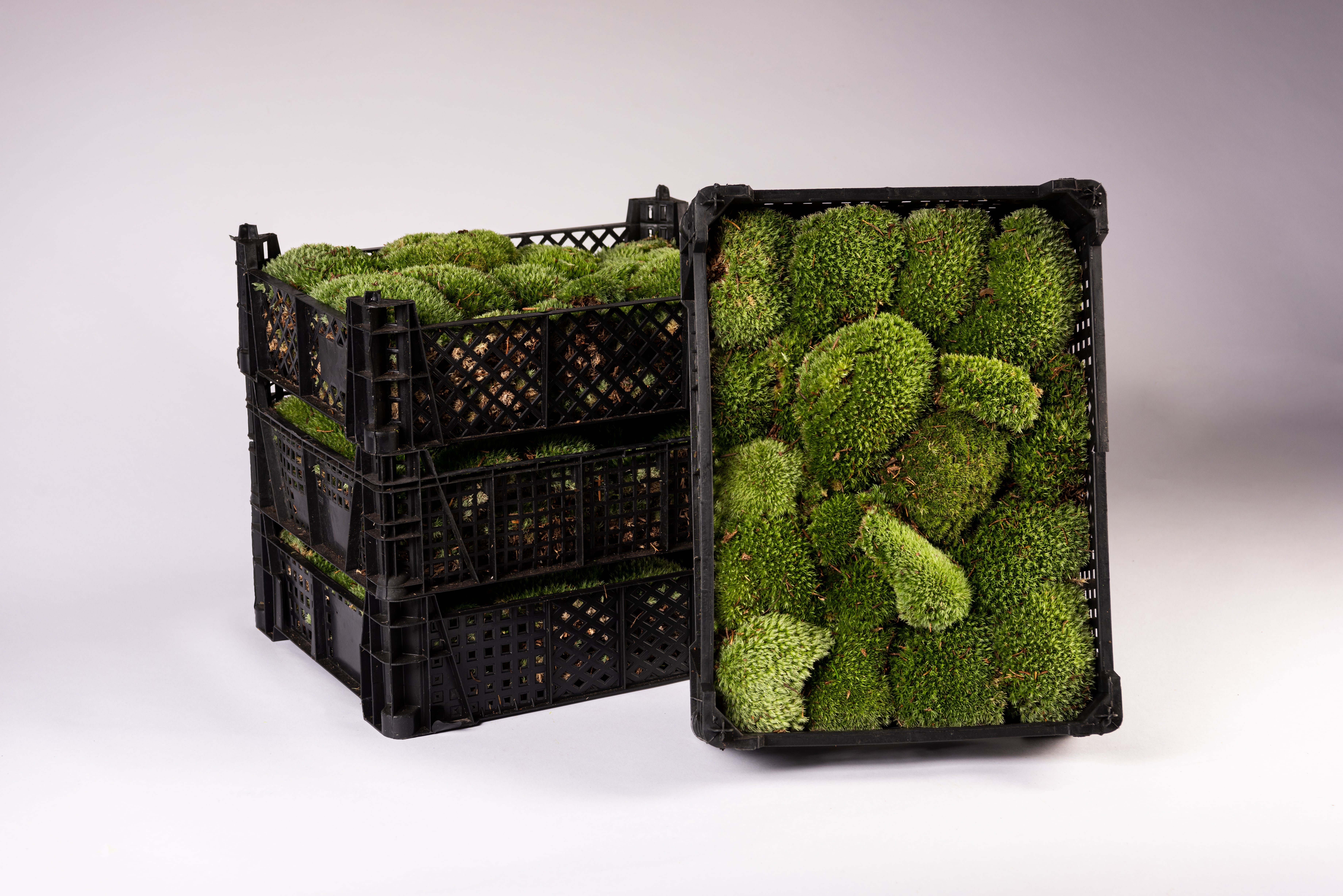 Wenn Sie viel frisches und lebendiges Kugelmoos zur Anzucht kaufen möchten, sind Sie hier in unserem Shop genau richtig. Hierbei handelt sich um ein lebendiges, unbehandeltes Naturprodukt, daher können Reste vom Waldboden wie Tannennadeln oder kleine Zweige etc. enthalten sein. Diese lebendigen Moospflanzen können sich bei Trockenheit hell und ins bräunliche verfärben. Um den Grünton zu erhalten, sollten die Mooskugeln feucht gehalten werden. Ein qm (Quadratmeter) Kugelmoos entspricht in etwa 120 Mooskugeln.Sie erhalten 4 Kisten á 40 x 30 cm eng gepackt mit 2-3 Lagen frischem Bollenmoos. Diese große Menge an frischem Moos eignet sich zur Anzucht, als Fassadenbegrünung, zum Anlegen eines Dachgartens uvm.