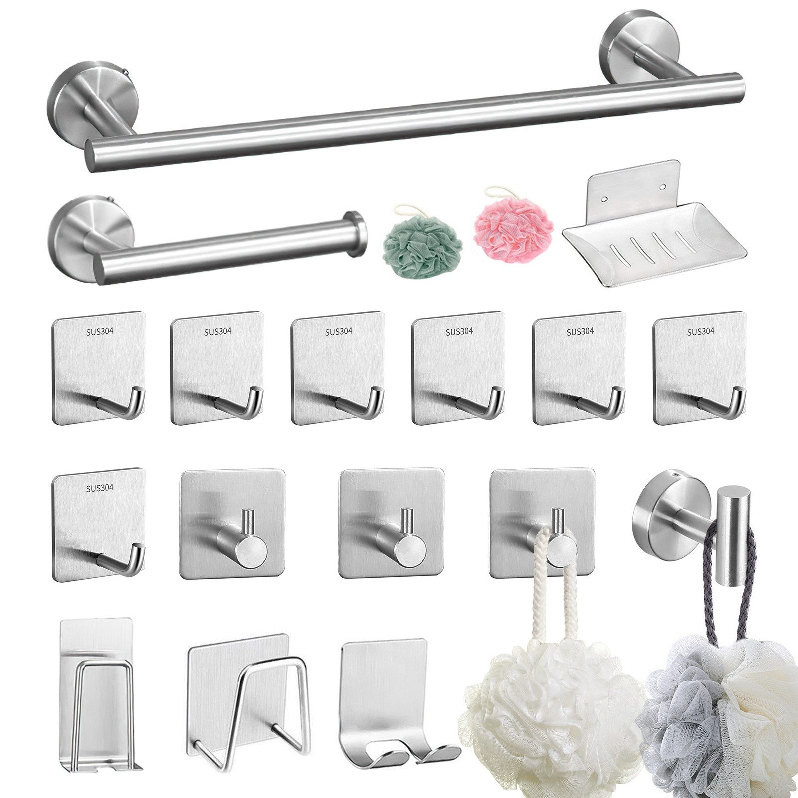 Dieses 18-teilige Badezimmer-Set sorgt für Ordnung in Ihrem Zuhause und organisiert Ihre Haushaltsgegenstände, um mehr Platz für Sie zu schaffen: Handtuchhalter für Handtücher und Kleidung, Toilettenpapierhalter für Toilettenpapier, Seifenhalter für Seife, klebrige Multifunktionshaken für Bad, Schlafzimmer, Waschküche und Küche, usw.