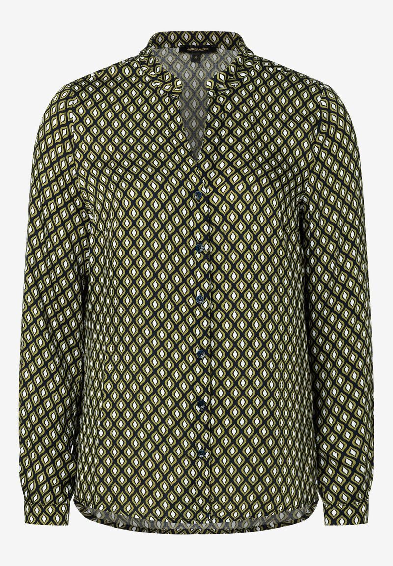 Die fließende Viskosebluse von MORE & MORE mit grafischem Print können Sie ganz klassisch mit gepflegter Businesshose kombinieren oder aber casual mit sportiver Jeans.