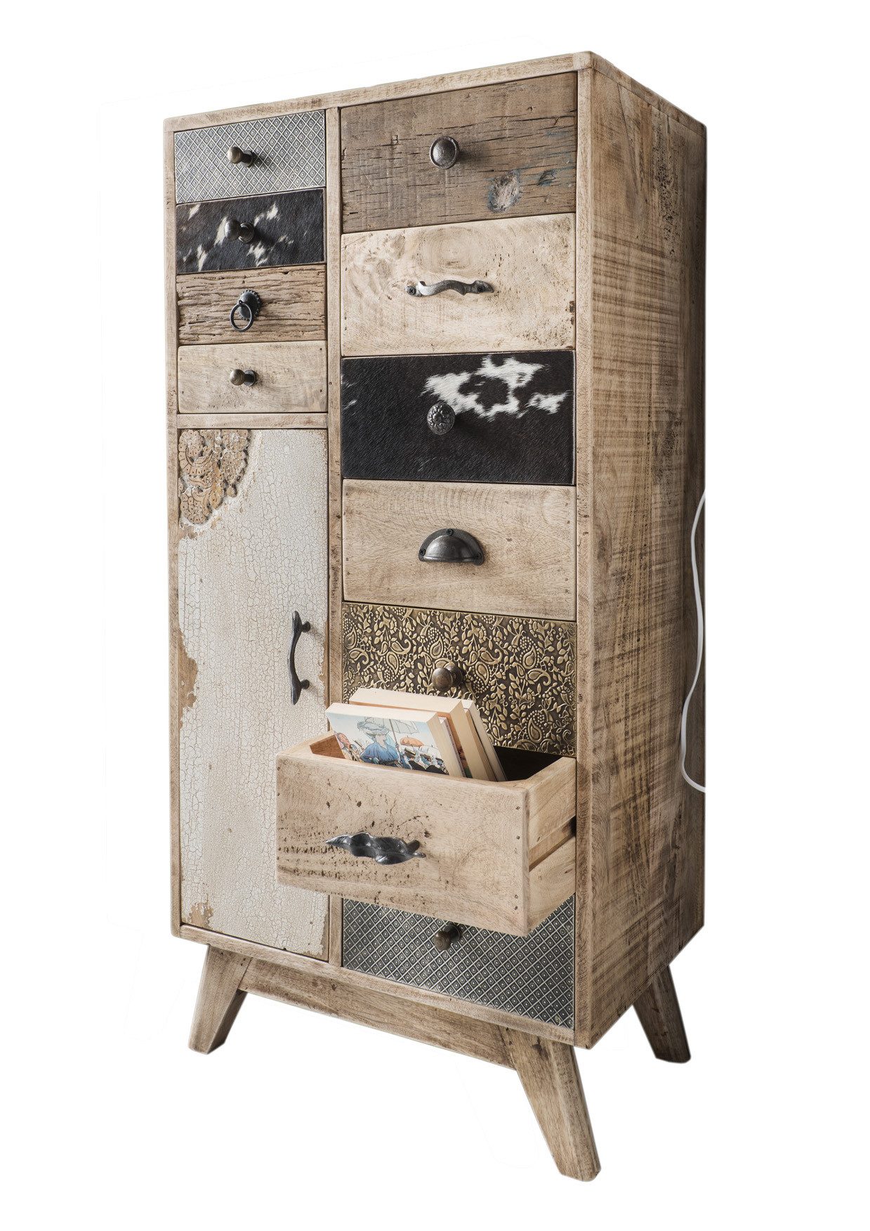 Die originelle Hoch-Kommode aus massivem Mangoholz besticht durch ihr spektakuläres Ethno-Design. Die 11 Schubladen und die Tür sind alle individuell aus Altholz, Metall oder mit echtem Fell gestaltet. Abgerundet wird das kreative Bild durch die unterschiedlichen nostalgischen Griffe. Jede Kommode ist ein kleines Raumwunder und ein Unikat.