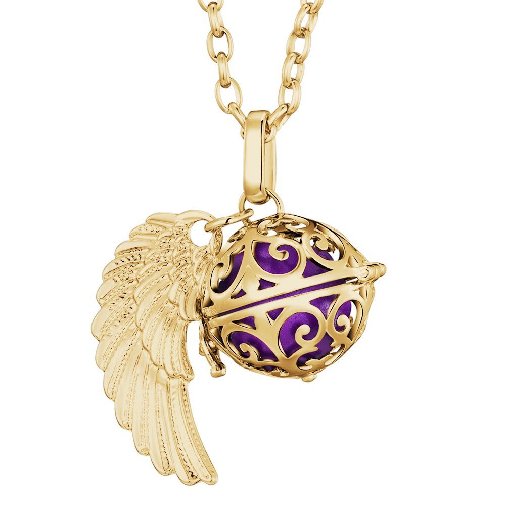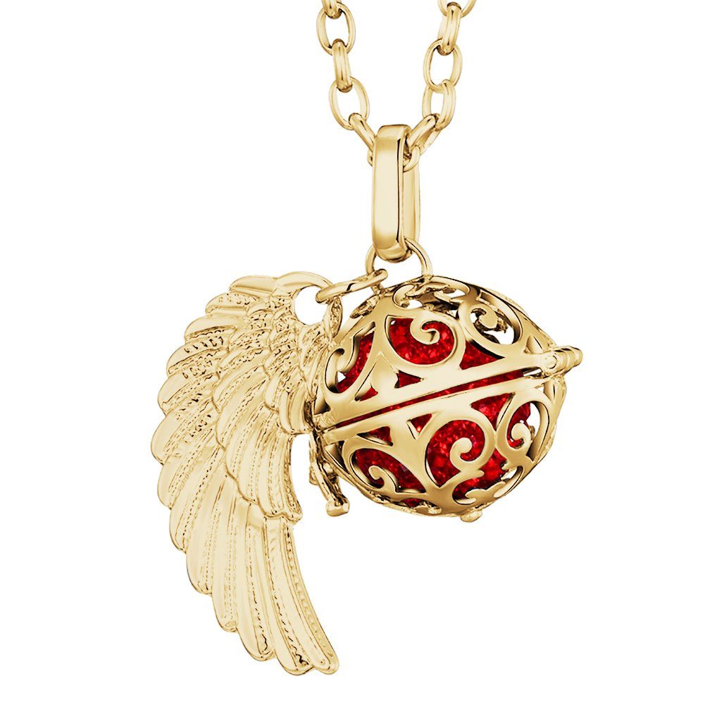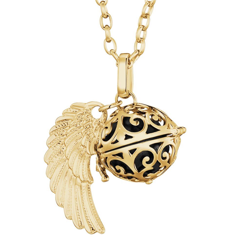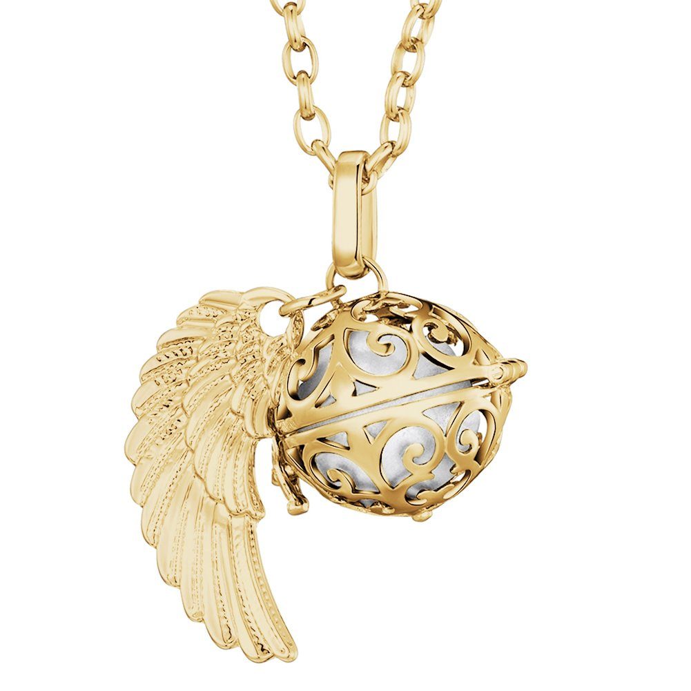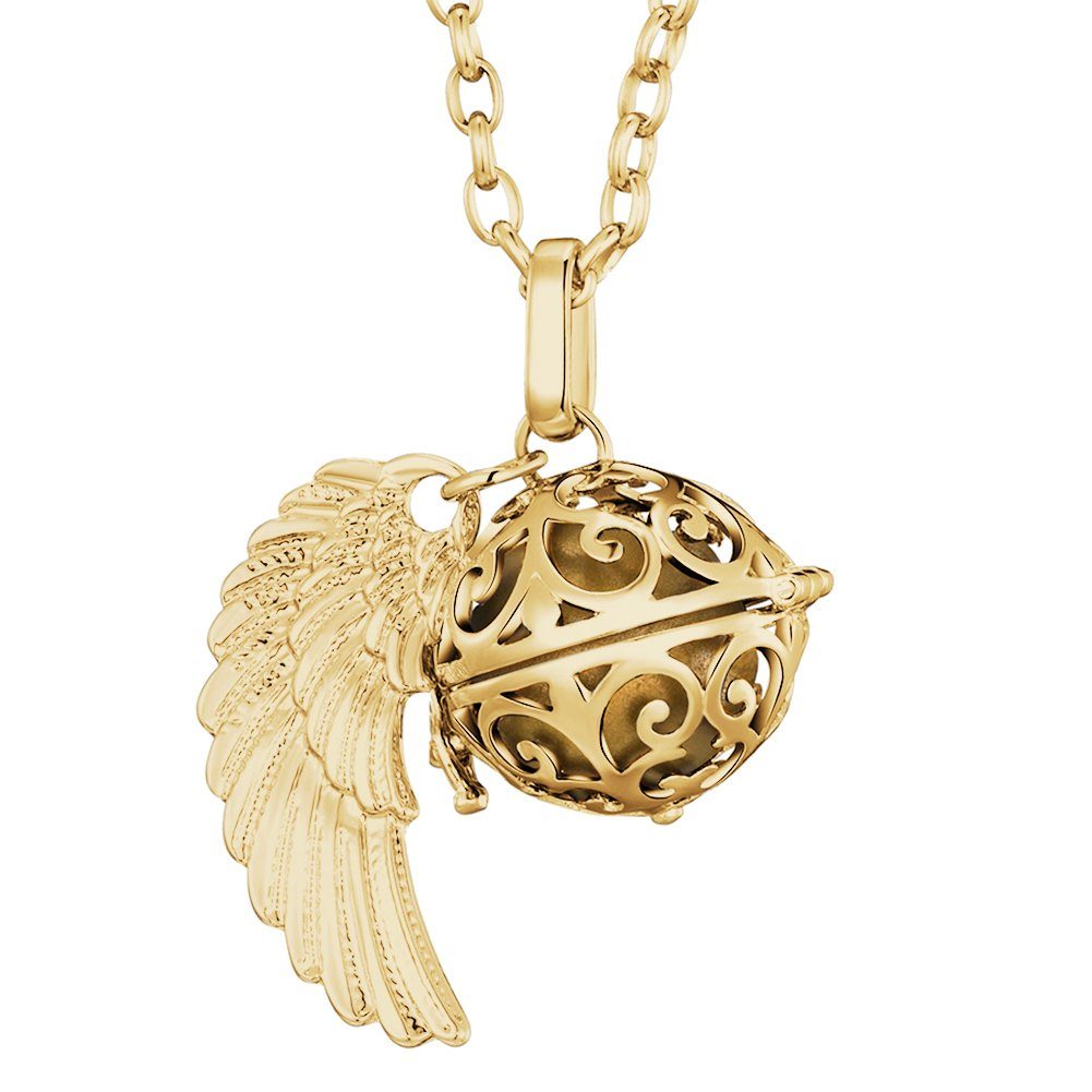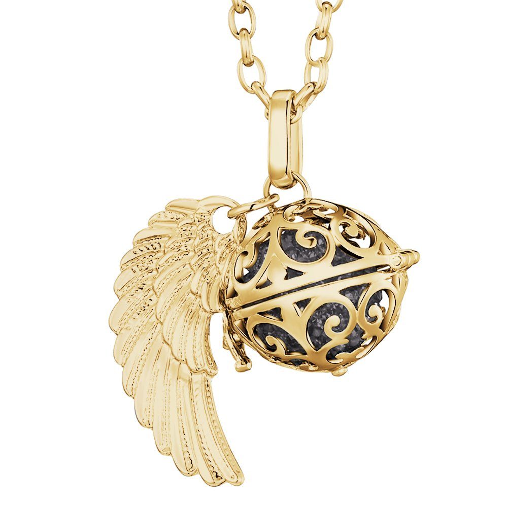 Diese wunderschöne goldene Engel-Halskette der Marke Morella wird aus feinstem Edelstahl gefertigt, der Anhänger ist aus einer hochwertigen Metalllegierung. Die Kette ist 70 cm lang und mit einem filigran herausgearbeiteten Anhänger samt Engelsflügeln ausgestattet. Im Inneren des Anhängers befindet sich eine farbige, 16 mm große Klangkugel, die bei jeder Bewegung ein zartes Klingeln erzeugt. Der Anhänger lässt sich mithilfe eines kleinen Verschlusses im Handumdrehen öffnen und schließen. Dadurch können die Klangkugeln ganz einfach ausgetauscht und farblich an die Kleidung und persönliche Stimmung angepasst werden. Die Halskette wird in einem schwarzen Samtbeutel geliefert - auch ideal als Geschenk.