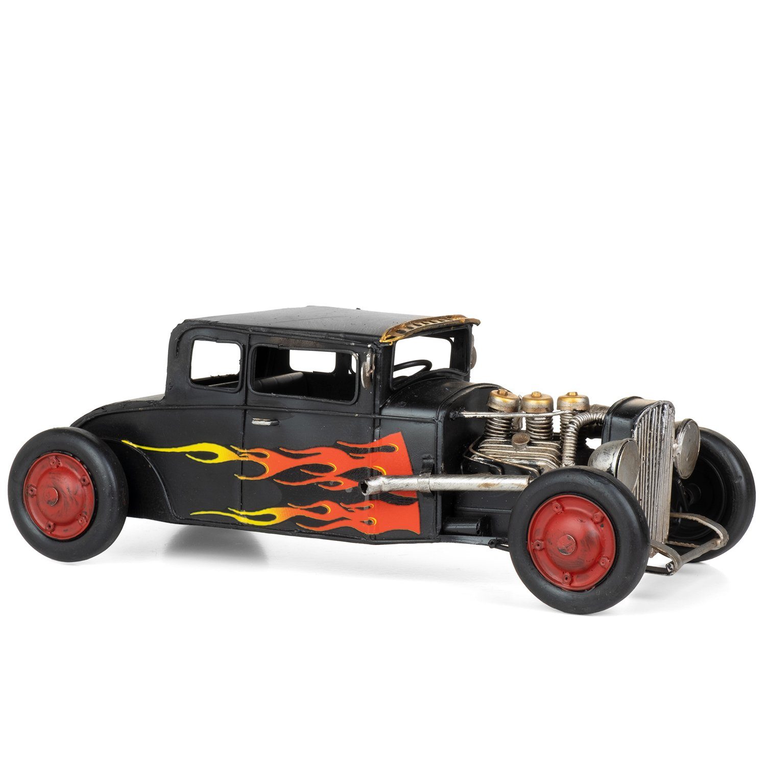 Nicht nur für Liebhaber von historischen Fahrzeugen, passt dieser Rennwagen mit Flammen Bemalung gut in das Regal oder auf den Schreibtisch.
