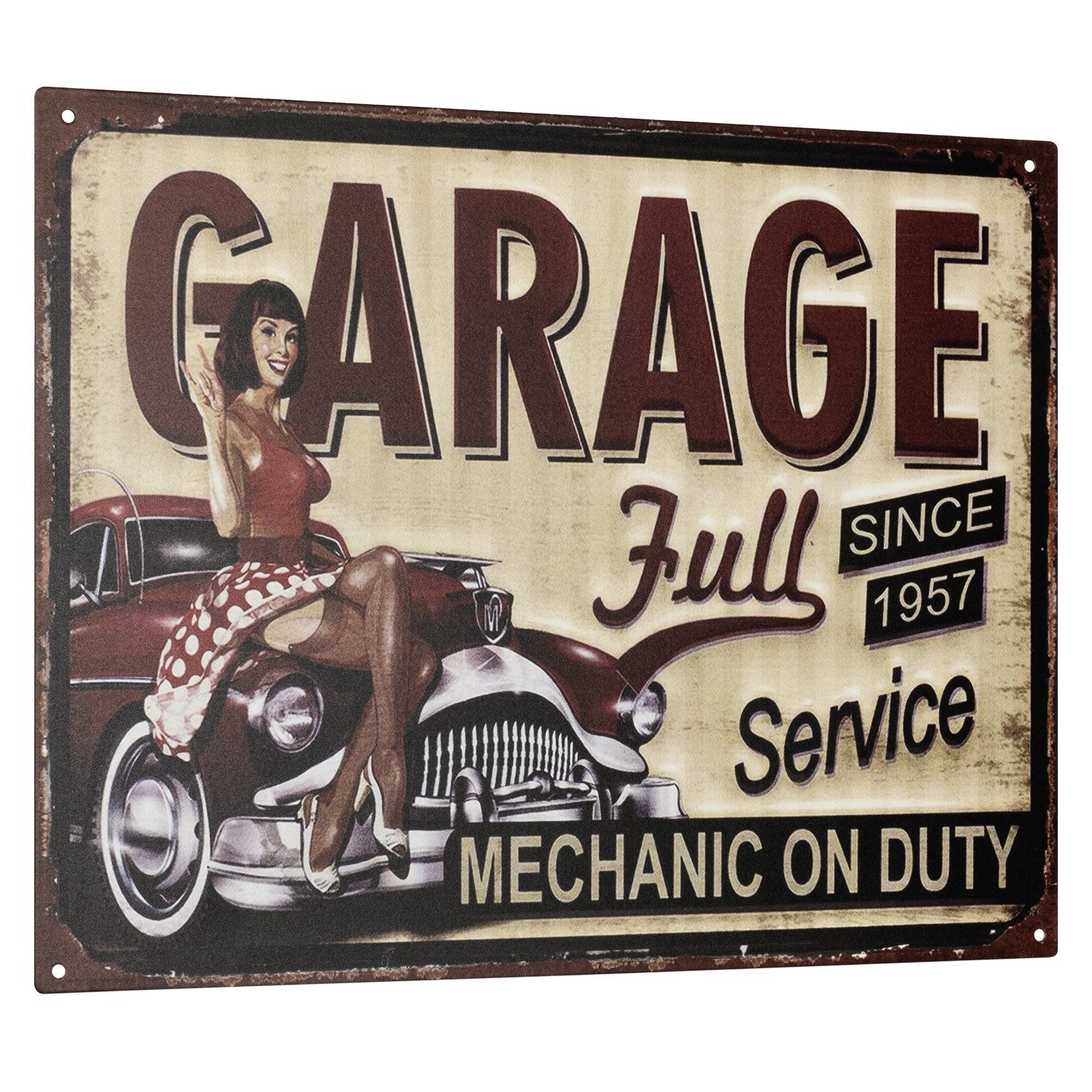 Nostalgisches Retro-Blechschild mit Aufdruck Garage Full Service Since 1957“ und klassischem Pin-up Motiv - dekoratives Highlight für Garage oder Männerzimmer