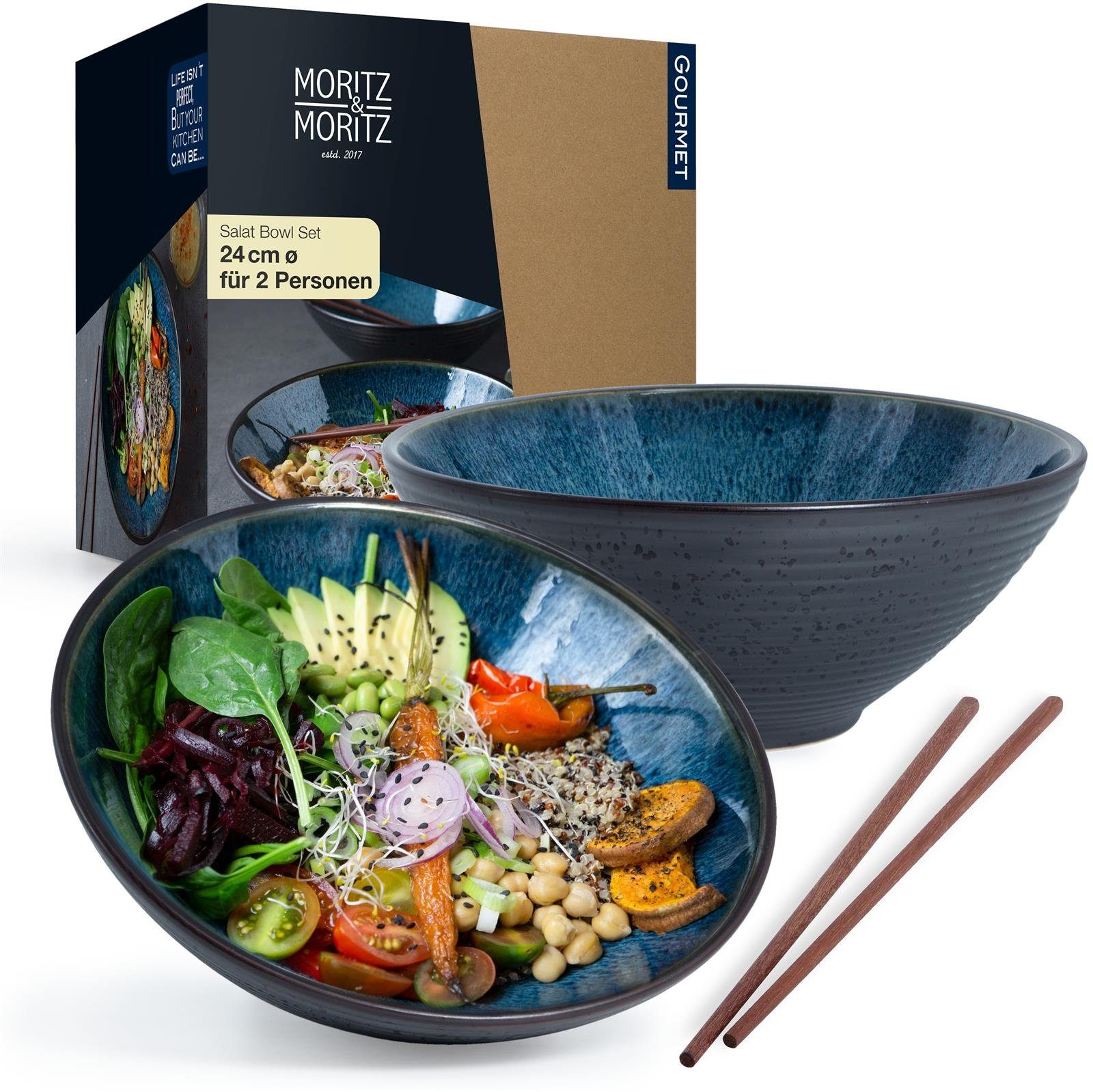 Moritz & Moritz 2x Salatschüssel Keramik 24 cm Ø - Bowl Schüssel blau für 2 Personen – Als Suppenschüssel, Ramen Schüssel, Servierschüssel und Buddha Bowl – Inkl. Stäbchen und Löffel