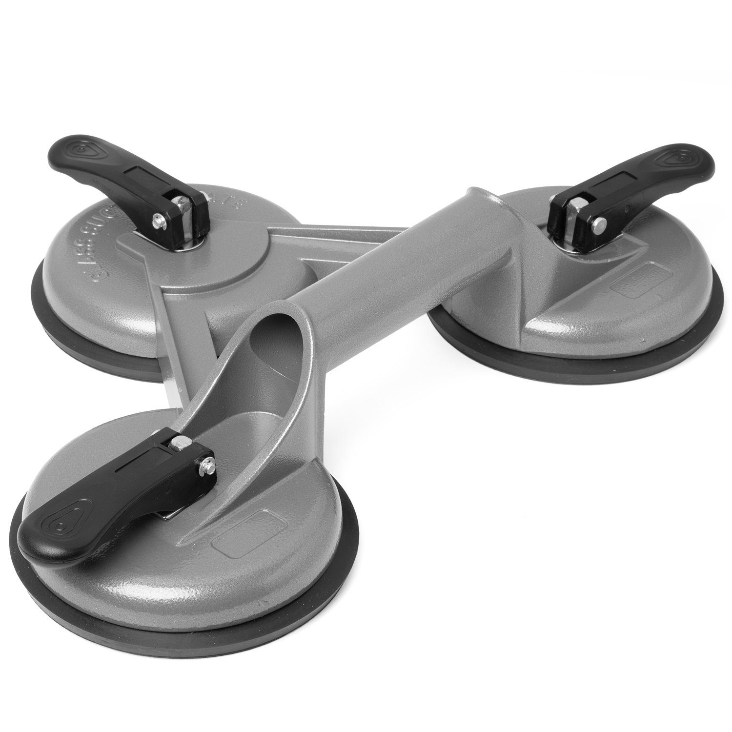 Saugheber mit 3 Saugnäpfen ALU / 120KG / Glasheber / Gummisauger / Vakuumsauger Der Saugheber der Marke Moritz ist das perfekte Werkzeug um z.B. Glasplatten sicher zu transportieren. Vorteile: - Handliche Form - Erzeugt ein Vakuum durch Klappen der Bügel Mit Schnell löse- bzw. Feststellhebel für jeden Saugnapf - Saugnäpfe aus weichem Spezialgummi passen sich optimal an - Saugheber-Korpus aus robustem, bruchfestem Aluminium Ideal geeignet für alle glatten Materialien, wie Glas, Blech, Kunststoff, beschichteten Sperrholzplatten und sämtlichen anderen glatten Oberflächen Technische Daten: Horizontale Kapazität max. 120 Kg Vertikale Kapazität max. 100 Kg Saugtellerdurchmesser 12 cm Gesamtlänge ca. Gewicht: