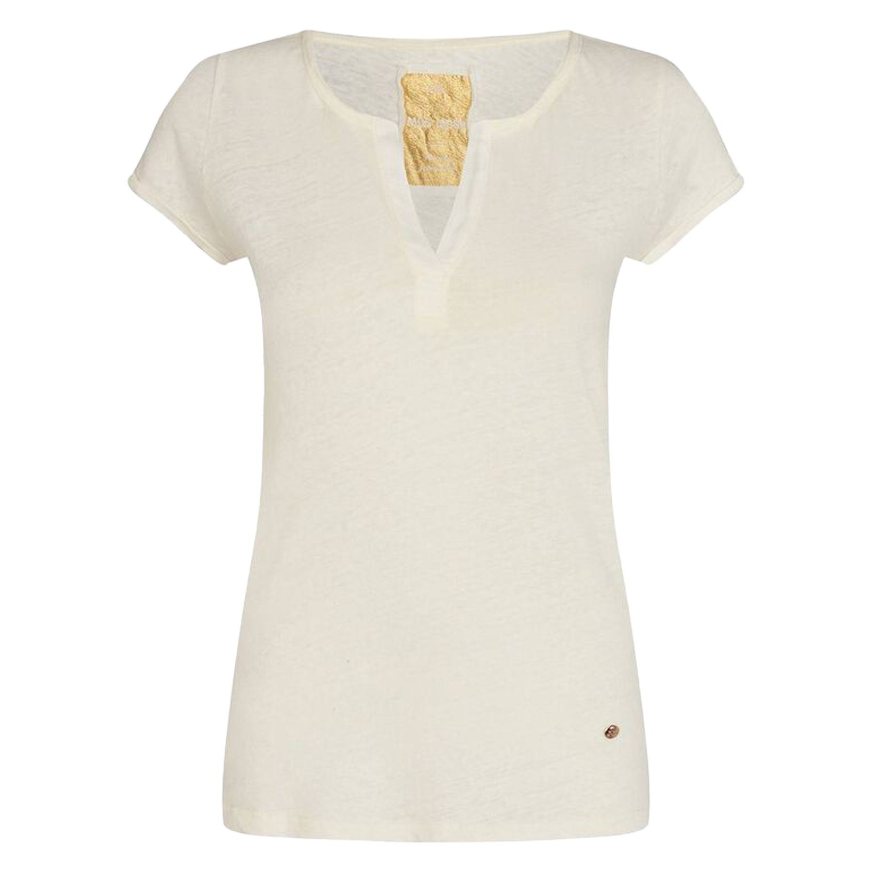 Das T-Shirt TROY von MOS MOSH in zartem Cremeweiß ist ein absolutes Basic-Must-Have für stilbewusste Frauen. Mit seinem geraden Schnitt und dem zeitlosen Design lässt es sich vielseitig kombinieren und eignet sich sowohl für den Alltag als auch für besondere Anlässe. Der Rundhalsausschnitt mit eingesetztem V verleiht dem Shirt eine feminine Note und setzt einen dezenten Akzent. Die offen versäuberten Kanten sorgen für einen modernen und lässigen Look, während die fixierten Umschläge an den Ärmelenden dem Shirt eine besondere Detailverliebtheit verleihen. Eine dezente Label-Applikation am Saum unterstreicht die hochwertige Verarbeitung und den unverkennbaren Stil von MOS MOSH. Das T-Shirt TROY wurde mit viel Liebe zum Detail und höchster Qualität in Portugal gefertigt und besteht aus einem angenehmen Baumwoll-Leinen-Mix, der für ein leichtes und luftiges Tragegefühl sorgt. Die Herstellerfarbe Ecru steht für eine zeitlose Eleganz und lässt sich mühelos in jeden Kleiderschrank integrieren. Ob zu Jeans, Shorts oder einem schicken Rock - das T-Shirt TROY ist ein vielseitiges Basic, das zahlreiche Kombinationsmöglichkeiten bietet und immer einen modernen und stilsicheren Auftritt garantiert.