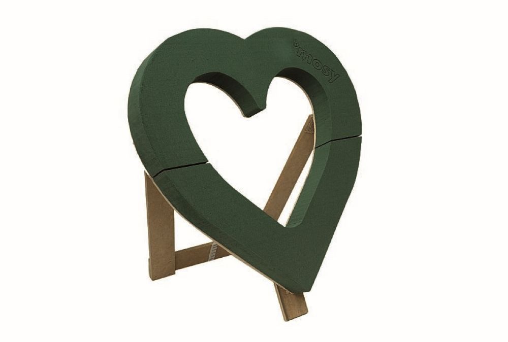 Steckschaum - Herz auf einer Naturholzunterlage mit stabilem standsicheren Ständer aus Holz. Das Steckmasse-Herz hat einen Durchmesser von 50 cm gemessen von oben bis zur Spitze. Der Steckschaum eignet sich zum Stecken von Frischblumen. Sehr beliebt für Blumenschmuck in der Kirche bei Hochzeit oder Beerdigung.