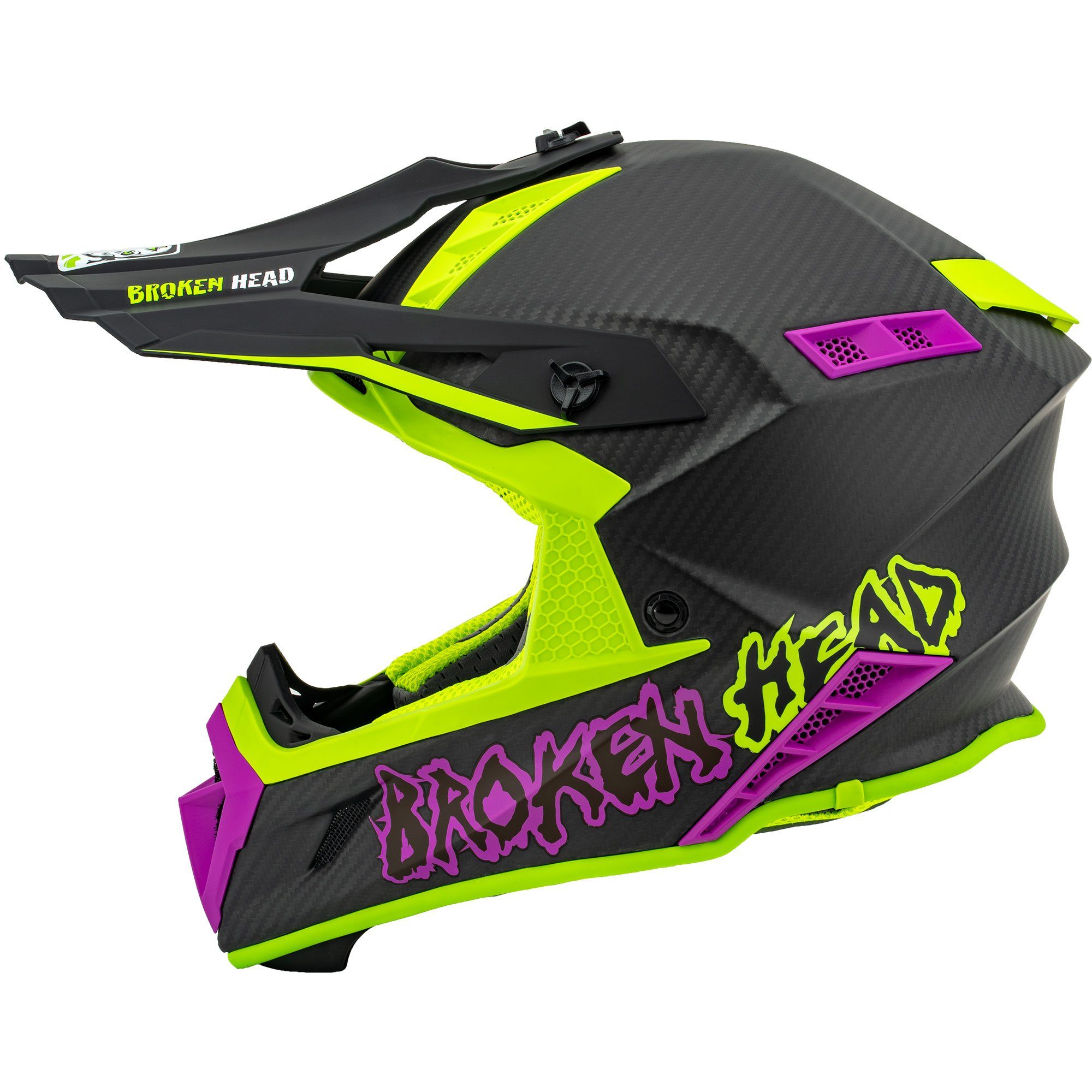 Stell dir mal vor, Du fährst auf Deiner Motocross Strecke durch das Gelände. Du bereitest dich gerade auf Deinen nächsten Wettkampf vor, deswegen trainierst du lang und hart. Und das Gefühl von Nackenschmerzen und einem schweren Kopf kommen Dir nur allzu bekannt vor? Dann wird der Hunter light in green-pink Dein neuer bester Freund werden! Der Helm besteht aus Carbon und wiegt gerade einmal 960 Gramm. Das Material ist extrem leicht und bietet zudem den optimalen Schutz. Die Farben des Helms sind sehr intensiv und auffallend, Du stichst den anderen richtig ins Auge! Nach langem Kräftemessen kann es auch mal schwitzig werden, aber keine Sorge, Du kannst das Innenpolster einfach herausnehmen und in die Waschmaschine schmeißen! Werde zum richtigen Jäger und jage mit dem The Hunter von Broken Head dem Sieg hinterher! Hole ihn Dir jetzt!