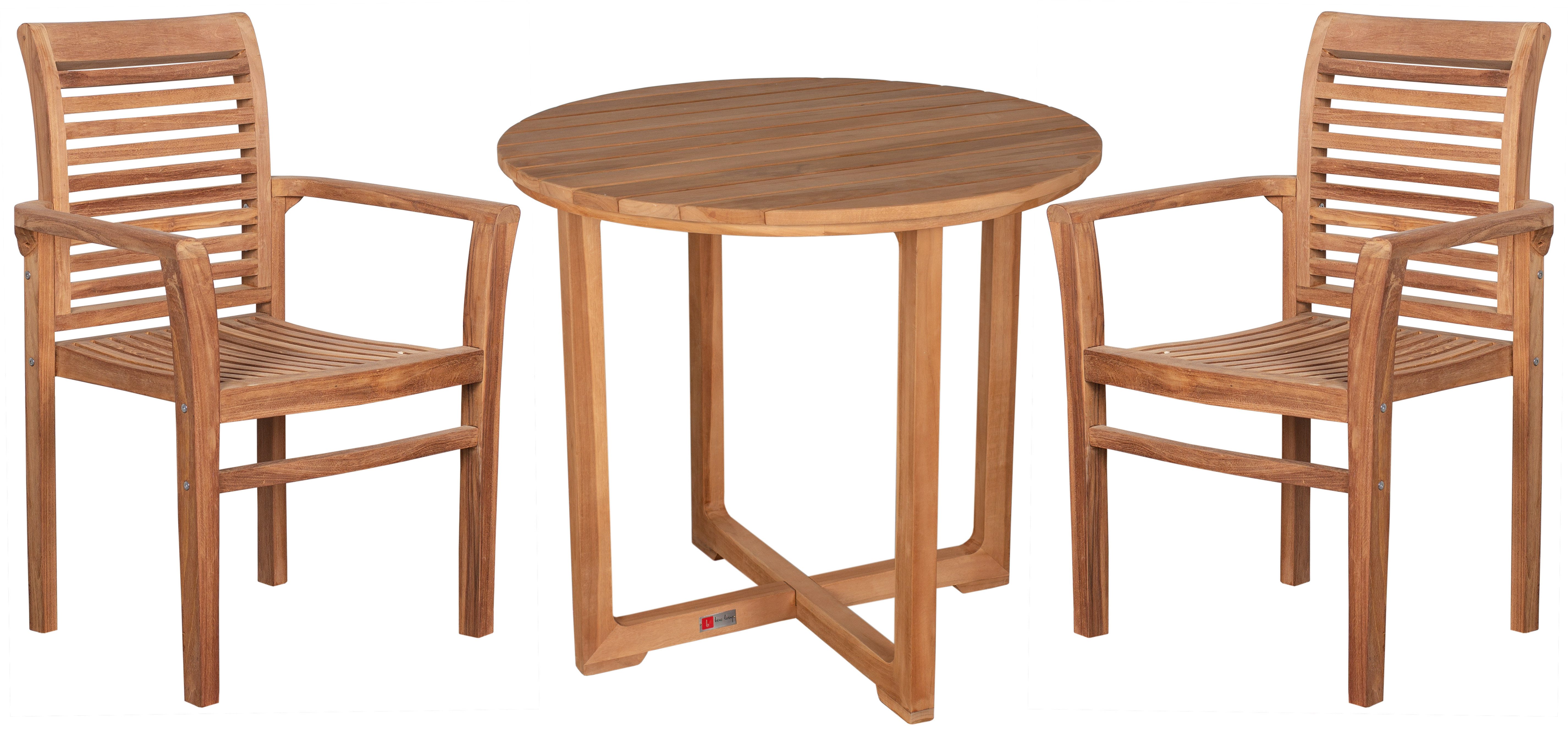 Bestehend aus: 2 Stück Teak Stapelsessel Derby sowie 1 Teak Tisch Retford