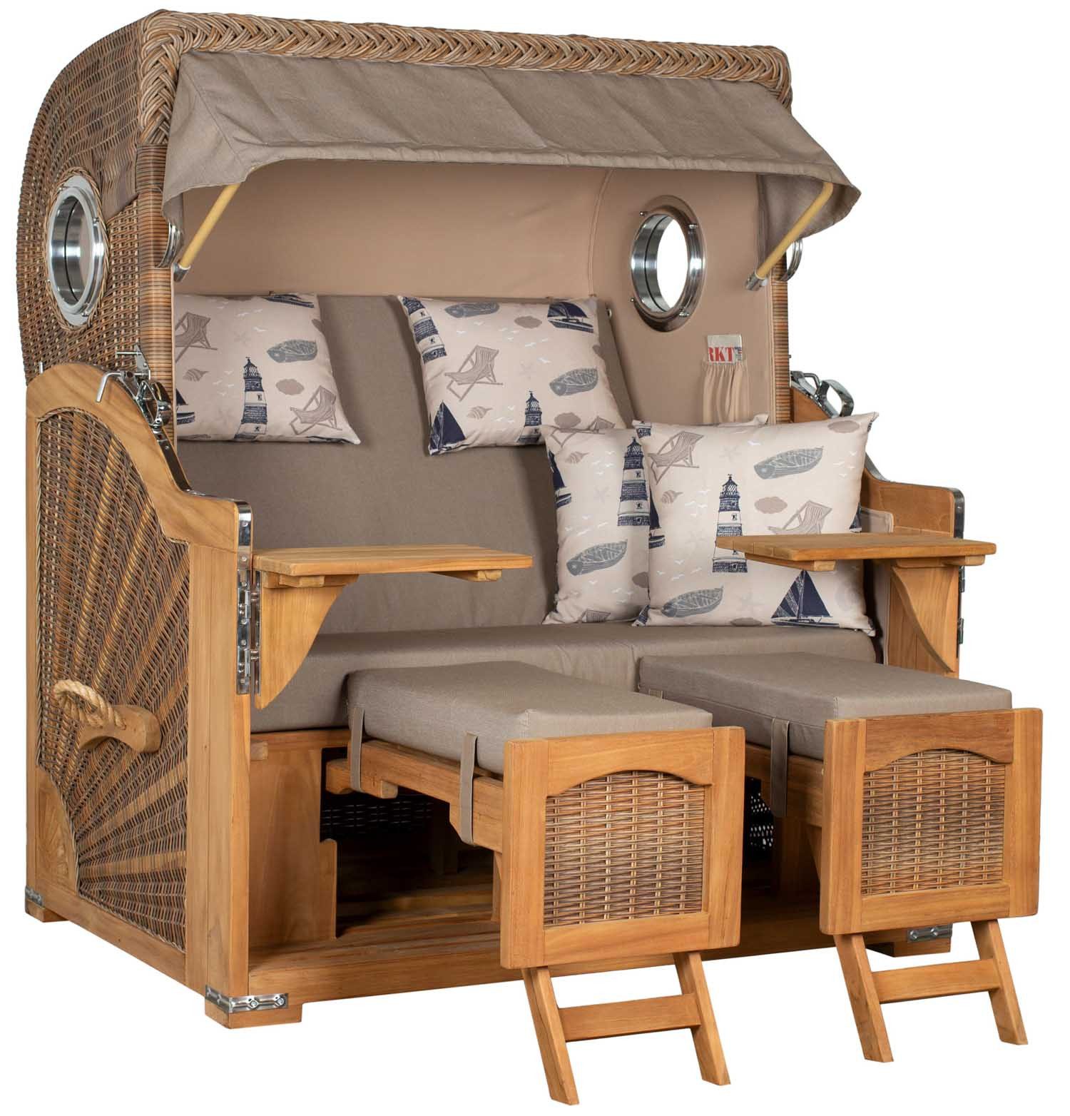 Die wechselbaren Polster und waschbaren Bezüge sind praktische Features des Düne Grande Bullauge. Sie erleichtern nicht nur die Pflege des Strandkorbs, sondern ermöglichen auch eine individuelle Gestaltung nach den eigenen Vorlieben. Die hochglanzpolierten Aluminium Bullaugen mit Sicherheitsglas setzen stilvolle Akzente und tragen zur Sicherheit bei. Dieser Strandkorb wird schnell zum zentralen Ort für entspannende Stunden, die sowohl allein als auch in Gesellschaft unvergesslich bleiben.