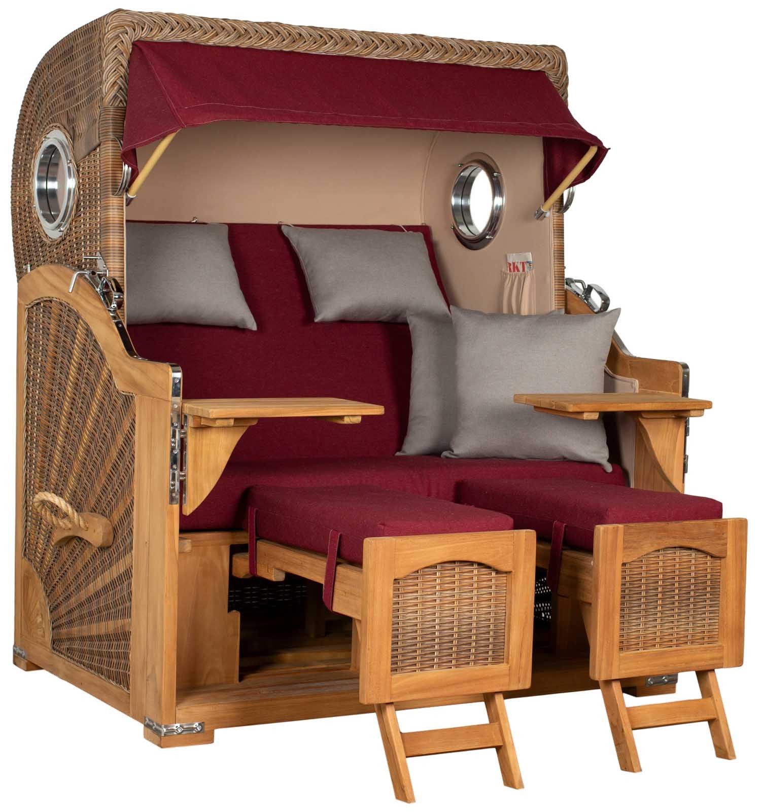 Der Strandkorb Düne Grande Bullauge ist die ideale Wahl für alle, die Wert auf Qualität und Stil legen. Gefertigt aus zertifiziertem Teak Vollholz, überzeugt er durch seine Langlebigkeit und natürliche Schönheit. Das hochwertige, UV-beständige PE-Geflecht sorgt dafür, dass der Strandkorb wind- und wetterfest bleibt, ohne dabei an Ästhetik zu verlieren. Er ist der perfekte Rückzugsort für entspannte Stunden im Garten oder am Strand.