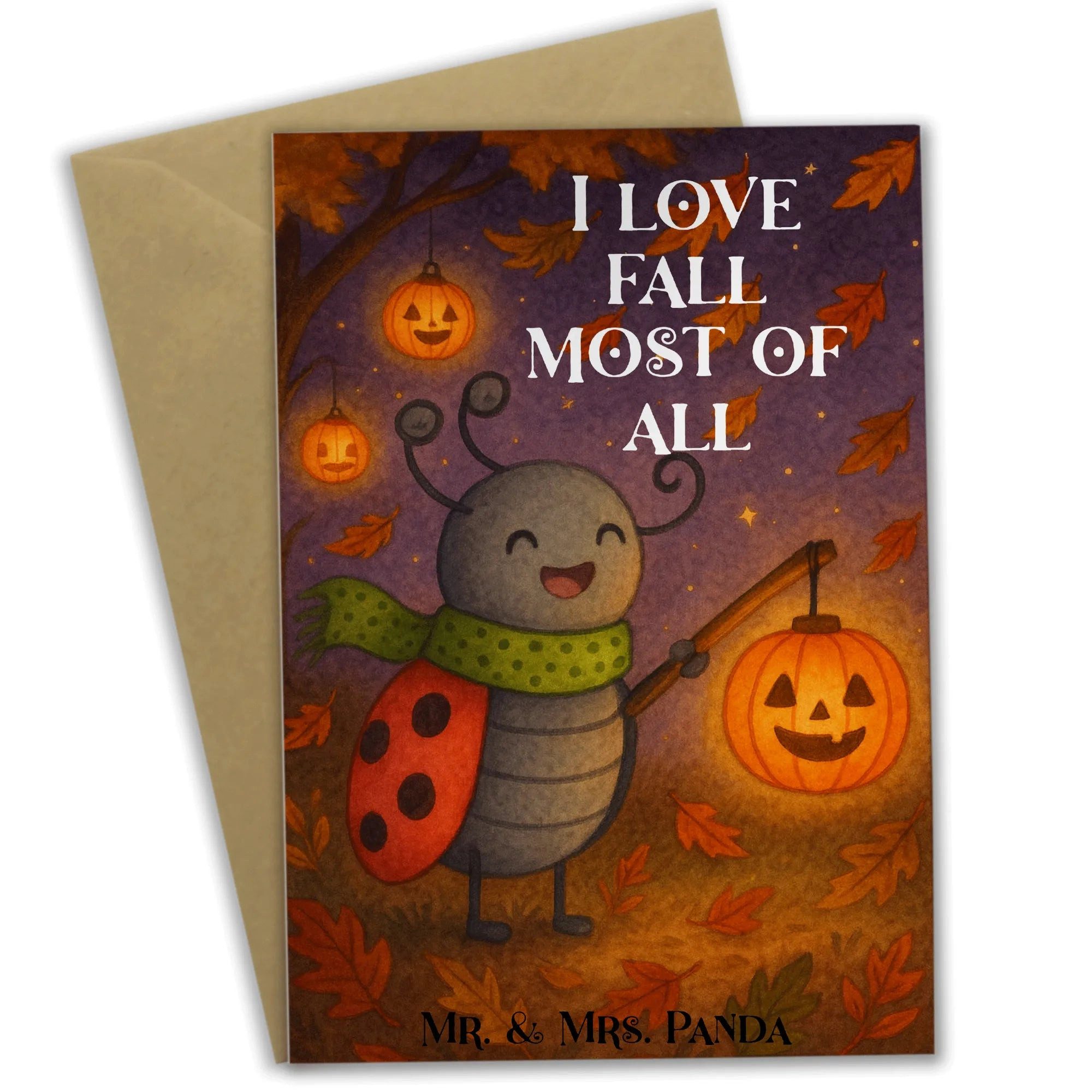 Smörle Laterne - Herzliche Herbstdeko mit Marienkäfer für ein gemütliches ZuhauseGib dich der Magie der Herbstnächte hin und lass dich vom süßen 'Smörle Laterne' Motiv von Mr. & Mrs. Panda inspirieren. In einem Meer aus Herbstfarben zeigt sich unser tapferes Insekt - ein handgemalter Marienkäfer, der stolz seine leuchtende Kürbislaterne präsentiert. Sein Lachen wirkt ansteckend und sein flauschiger, grün gepunkteter Schal lässt dich das Ambiente einer klaren Herbstnacht spüren. Lässt dich das auch nach einer heißen Schokolade und Kuscheldecke sehnen?