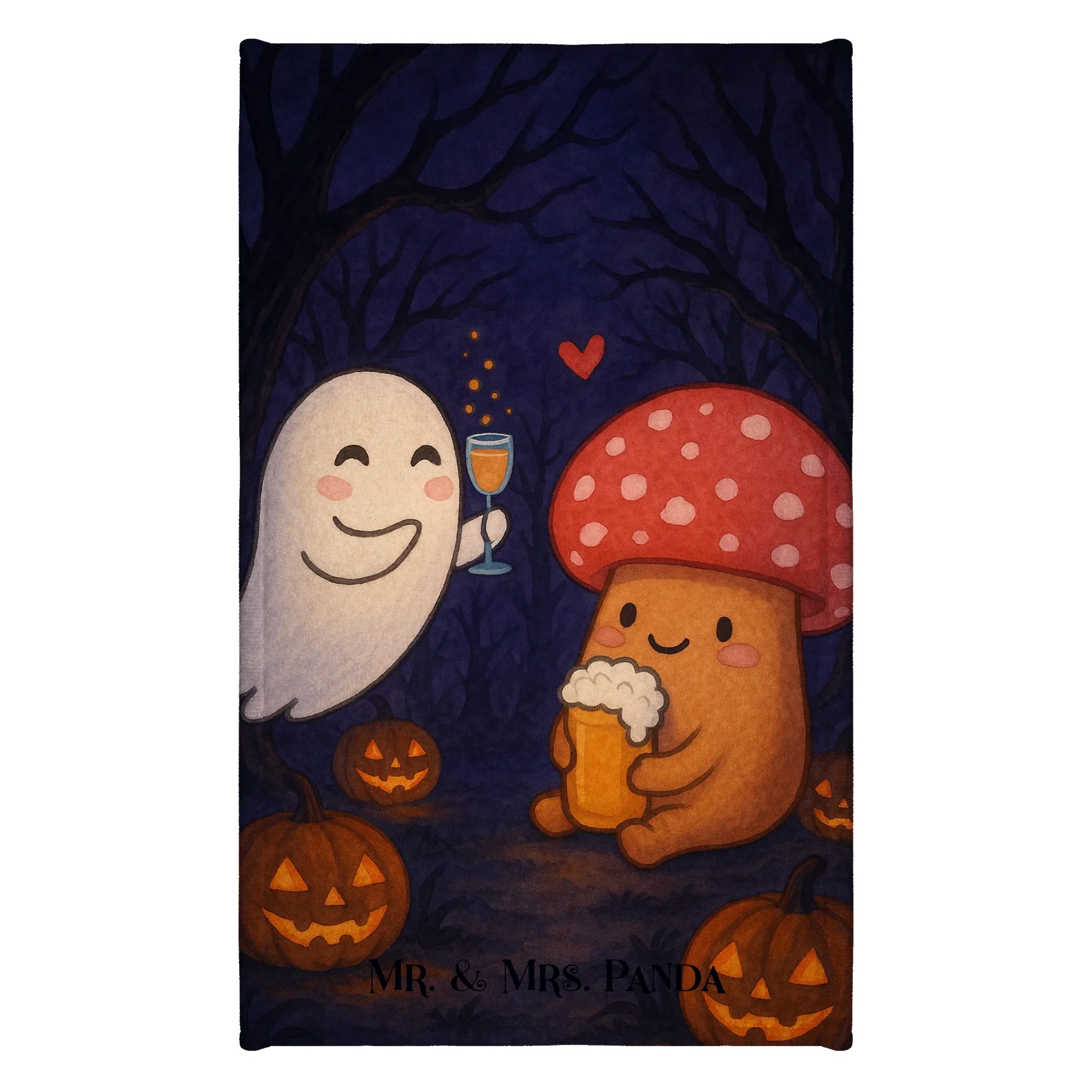 Fröhliches Gespenst Prost – Stimmungsvoll anstoßen in fröhlicher Runde!Tritt ein in die fabelhafte Welt von Mr. & Mrs: Panda, wo Freundschaft, Phantasie und Freude in jeder Zeichnung lebendig werden. Lass Dich verzaubern von unserem liebevoll gezeichneten prostenden Gespenst. Ein süßes Gespenst, Sektgläser schwingend, teilt seine Tagesgeschichten mit seinem besten Freund, einem niedlichen Fliegenpilz, der ein Pils in der Hand hält.