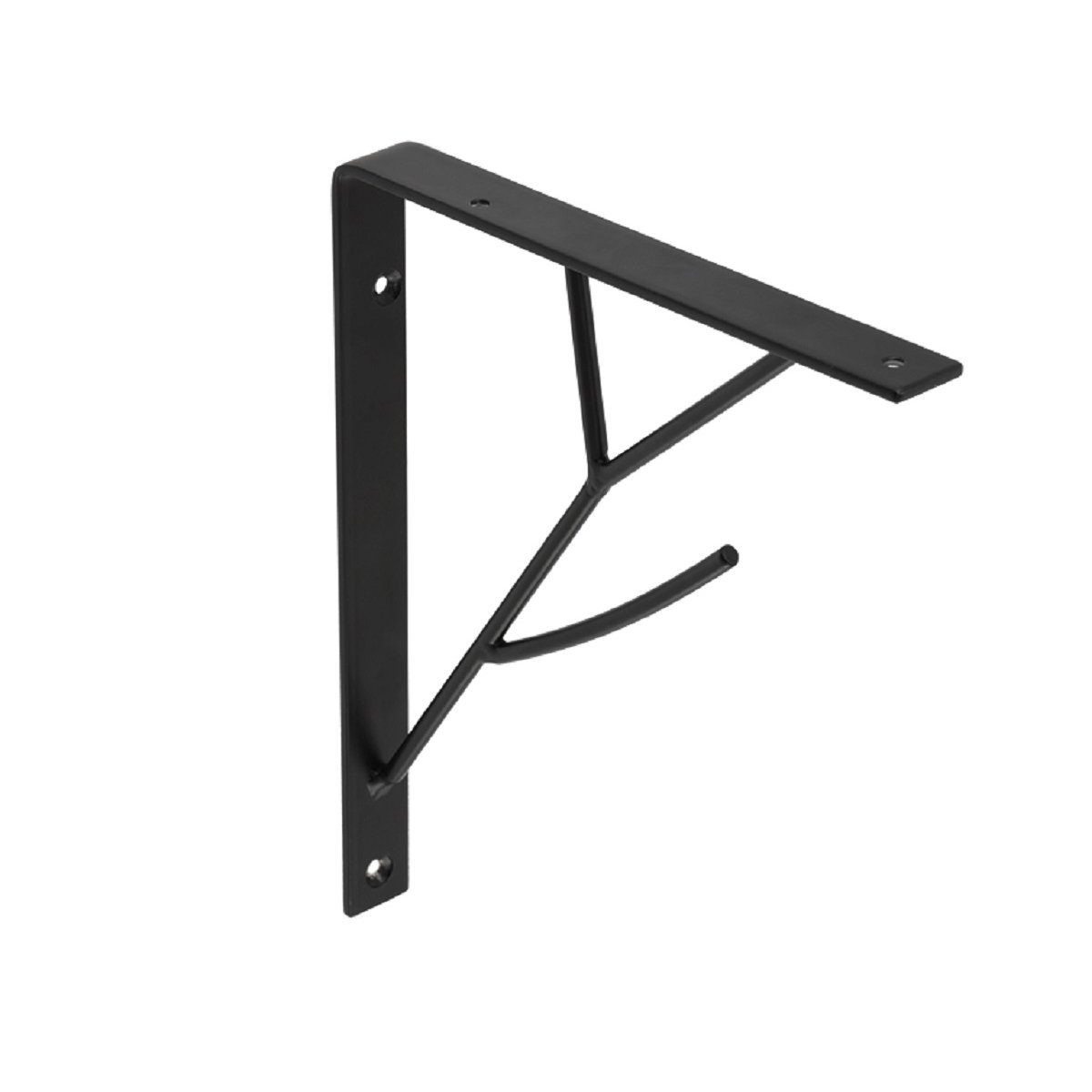 Das Modell Tree aus schwarz matt beschichtetem Stahl hat ein Schenkelmaß von 200mm x 170mm und eine Breite von 20mm. Die Materialstärke der Konsole liegt bei 4mm und ist somit ideal um Bücherregale oder Ablagen selbst zu bauen. Dank der Innenstangen, die wie ein Baum wirken, können Sie mit diesen Konsolen auch spielend leicht eine Garderobe selbst bauen. Als Kleiderhaken dient Ihnen der Ast der nach vorne absteht. Hiermit sind Ihren Ideen keine Grenzen gesetzt. Bitte beachten Sie das die Tragbarkeit nur bei idealer Befestigung gewährleisten werden kann. Bitte bedenken Sie das Sie mindestens zwei der Konsolen benötigen - der Preis bezieht sich nur auf ein Stück.