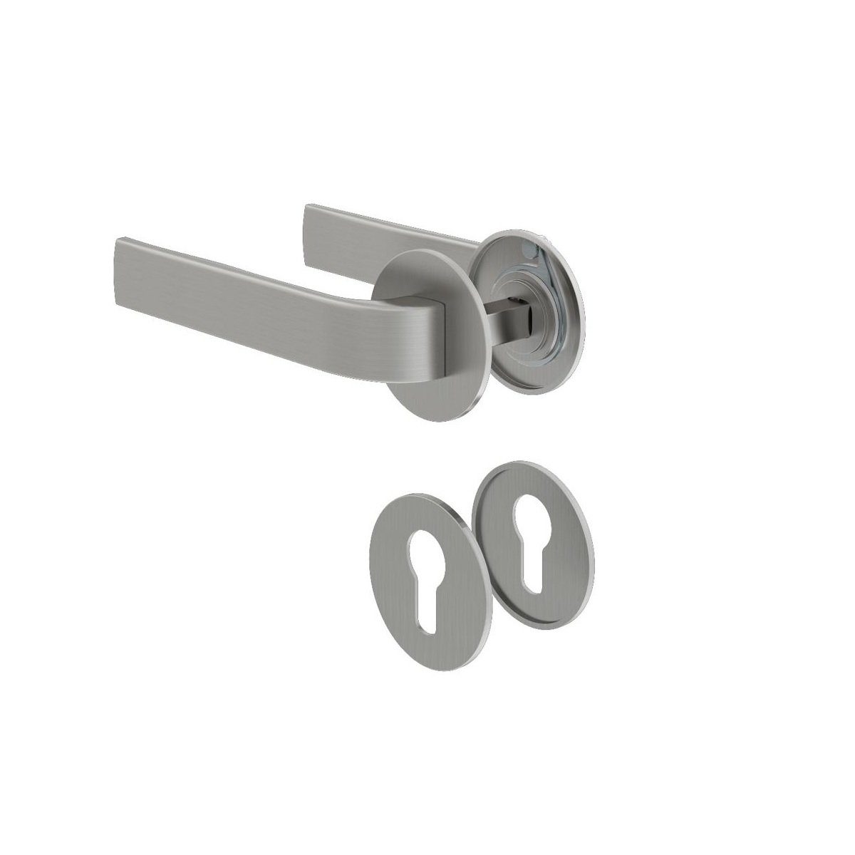 Hochwertige und zeitlos schöne Rosettengarnitur aus massivem Zamak in geschliffener Edelstahl-Optik. Zur Auswahl stehen Ihnen bei unserem Modell Offenbach-R die drei bekannten Ausführungen (Schlossformen) Buntbart, Profilzylinder und WC DIN Norm. Diverse weitere Türbeschläge finden Sie in unserem Меню.