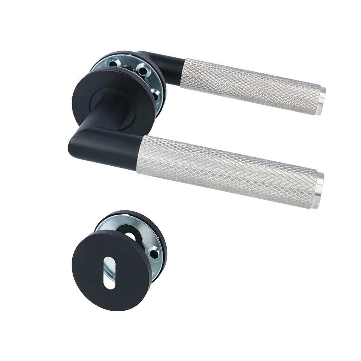 Ob im Wohnbereich, Badezimmer oder Arbeitszimmer – die Rosettengarnitur passt dank seiner verschiedenen Ausführungen (BB, PZ, WC, Griffpaar) zu jeder Anwendung. Die strukturierte Edelstahl-Oberfläche wirkt nicht nur edel, sondern erhöht auch die Griffsicherheit. Die schwarze Rosette in flacher Bauweise sorgt für ein modernes Erscheinungsbild. Die Befestigung erfolgt verdeckt, die Montage ist DIN rechts und links möglich. Durch das mitgelieferte Montageset ist der Einbau einfach und effizient. Komplettset mit allem Zubehör – gleich bestellen und Türen stilvoll ausstatten!