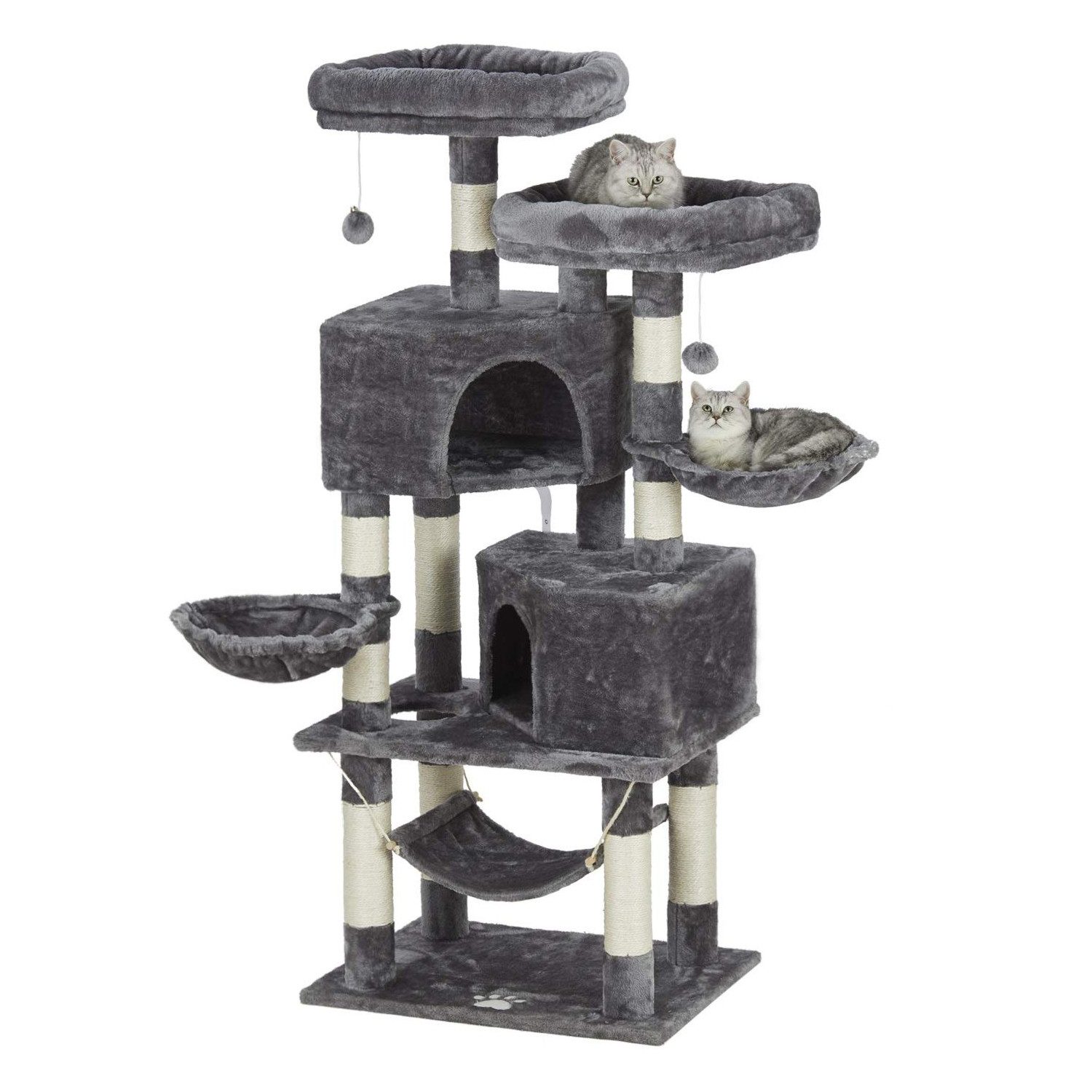 Stabilität umfasst drei Aspekte: Eckpfeiler, Struktur und Komponententeile. Dieser Kratzbaum verwendet eine super große Grundplatte (60 x 45 cm), eine vernünftige Struktur und verstärkte Säulen, um ihn in einem hervorragenden und stabilen Zustand zu halten.