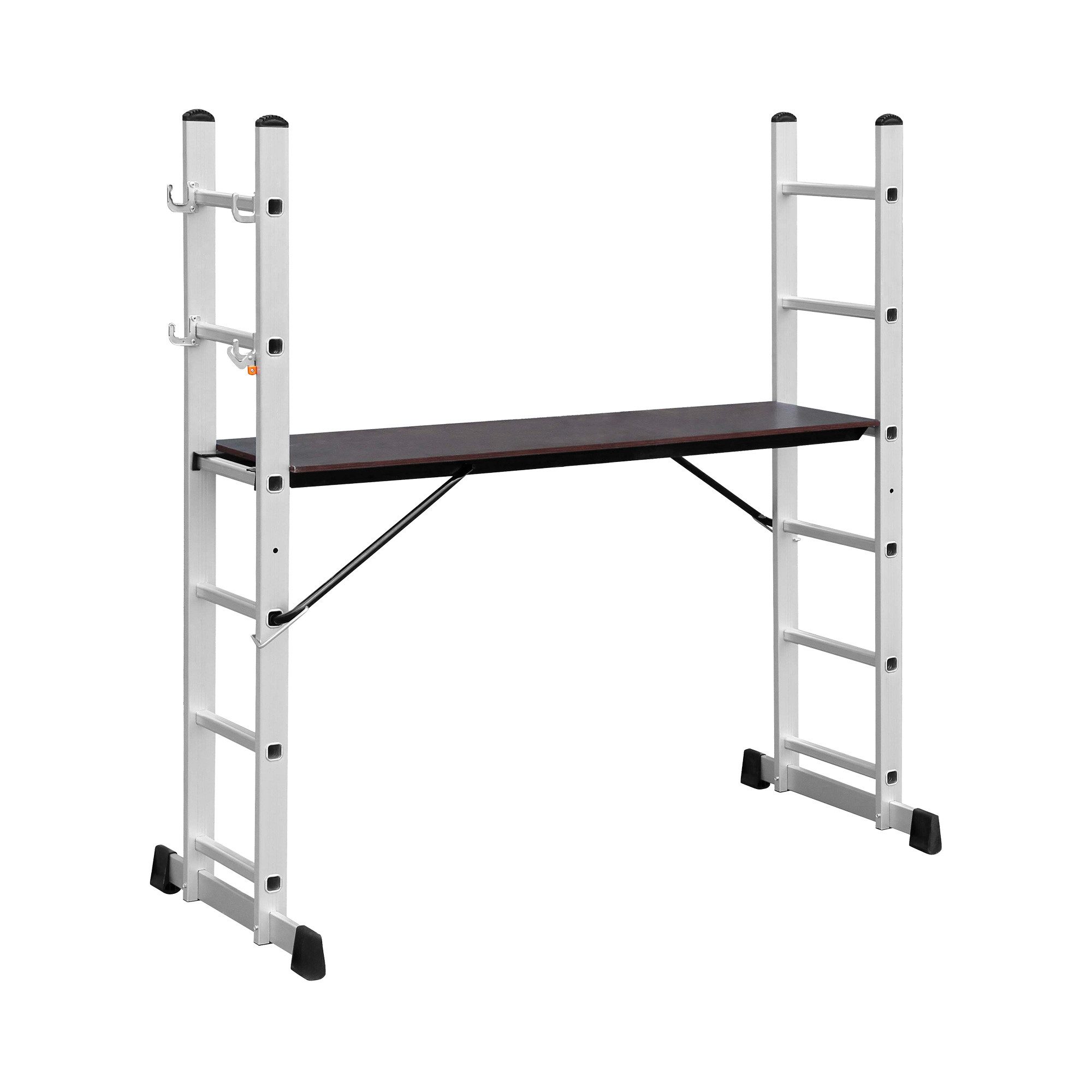 Diese Flexibilität ermöglicht Ihnen, verschiedene Aufgaben im Innen- und Außenbereich effizient zu bewältigen. Mit einer Tragfähigkeit von 150 kg und einer modularen Bauweise eignet sich das Gerüst ideal für Bau- und Industrieanwendungen.