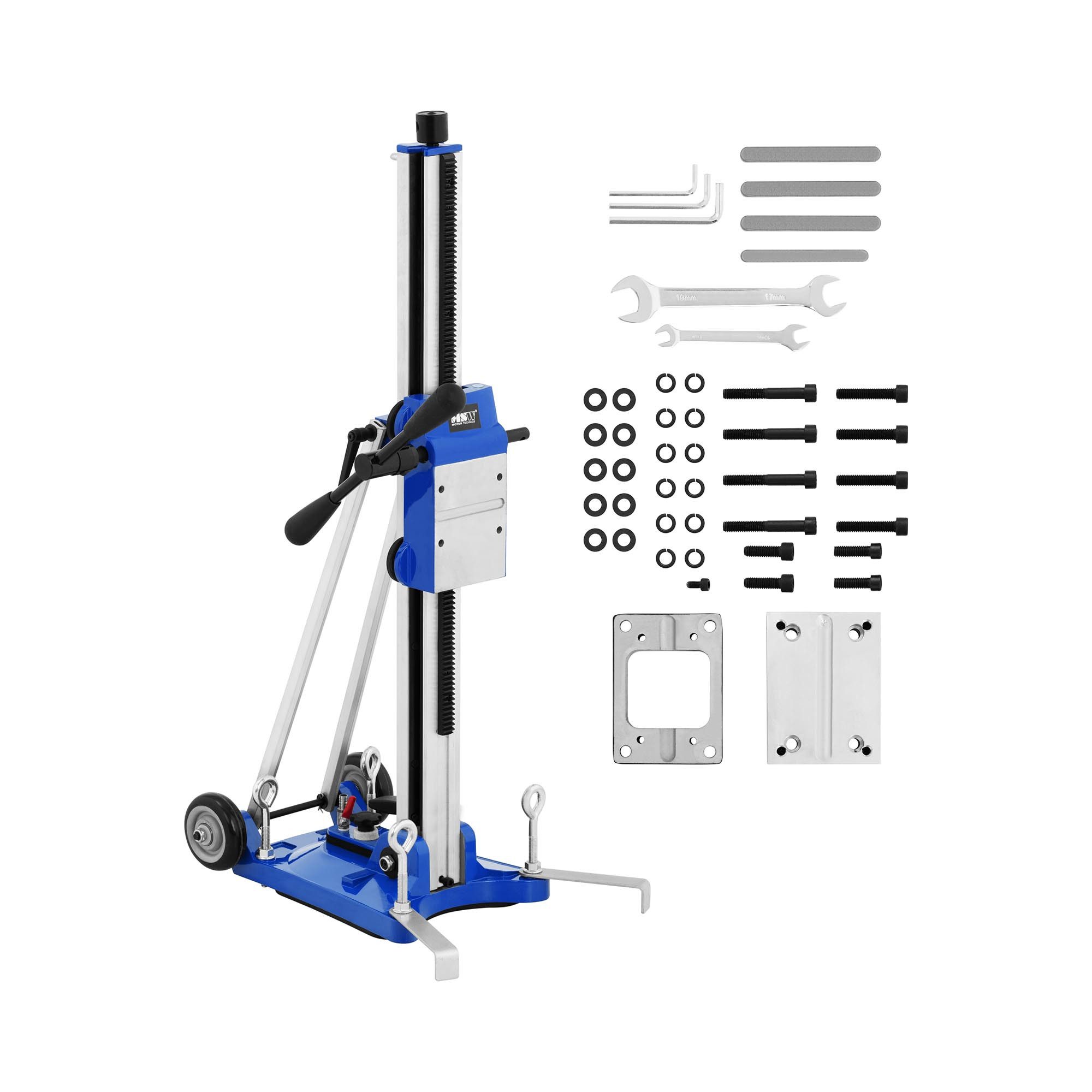 Der Kernbohrständer besteht aus einem Standfuß und einer Säule, an die Sie das Kernbohrgerät montieren. Der Standfuß ist mit vier Justierschrauben versehen, mit denen der Ständer an der Bohrstelle montiert werden kann. Zusätzliche Stabilität verschaffen zwei verstellbare Halterungen, mit denen eine maximale Standfläche von 400 x 480 mm erzielt wird.