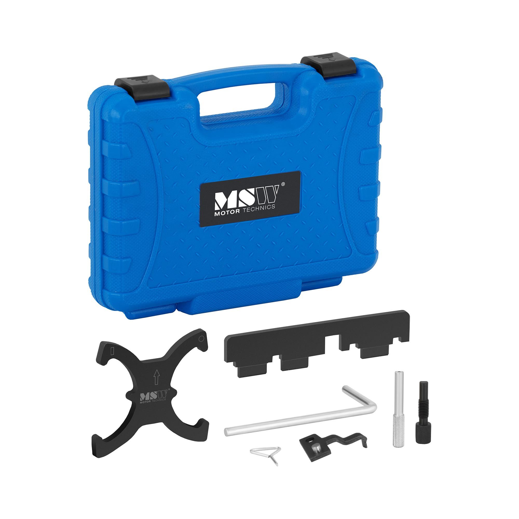 Lieferumfang | Motor-Einstellwerkzeug MSW-ETT-132 Nockenwellenfixierungen2 Fixierstifte KurbelwelleEinstellwerkzeug Riemenscheibe der KurbelwelleNockenwellenlinealFixierstift für SpannrolleTransportkoffer |