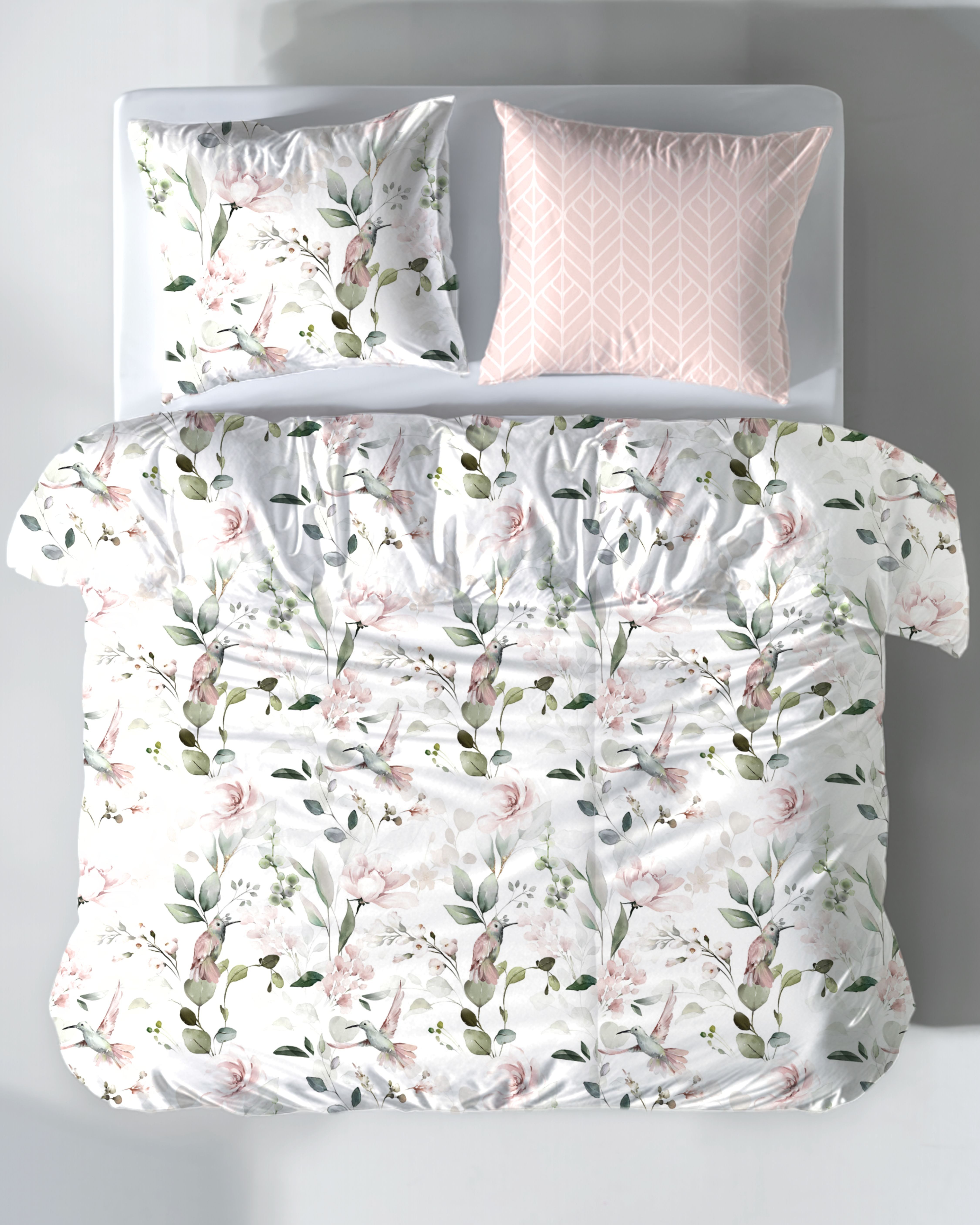 DESIGN : moderne Bettwäschegarnitur Kolibri & Blumen • Wende-Motiv in zarter Aquarell-Optik • rosa