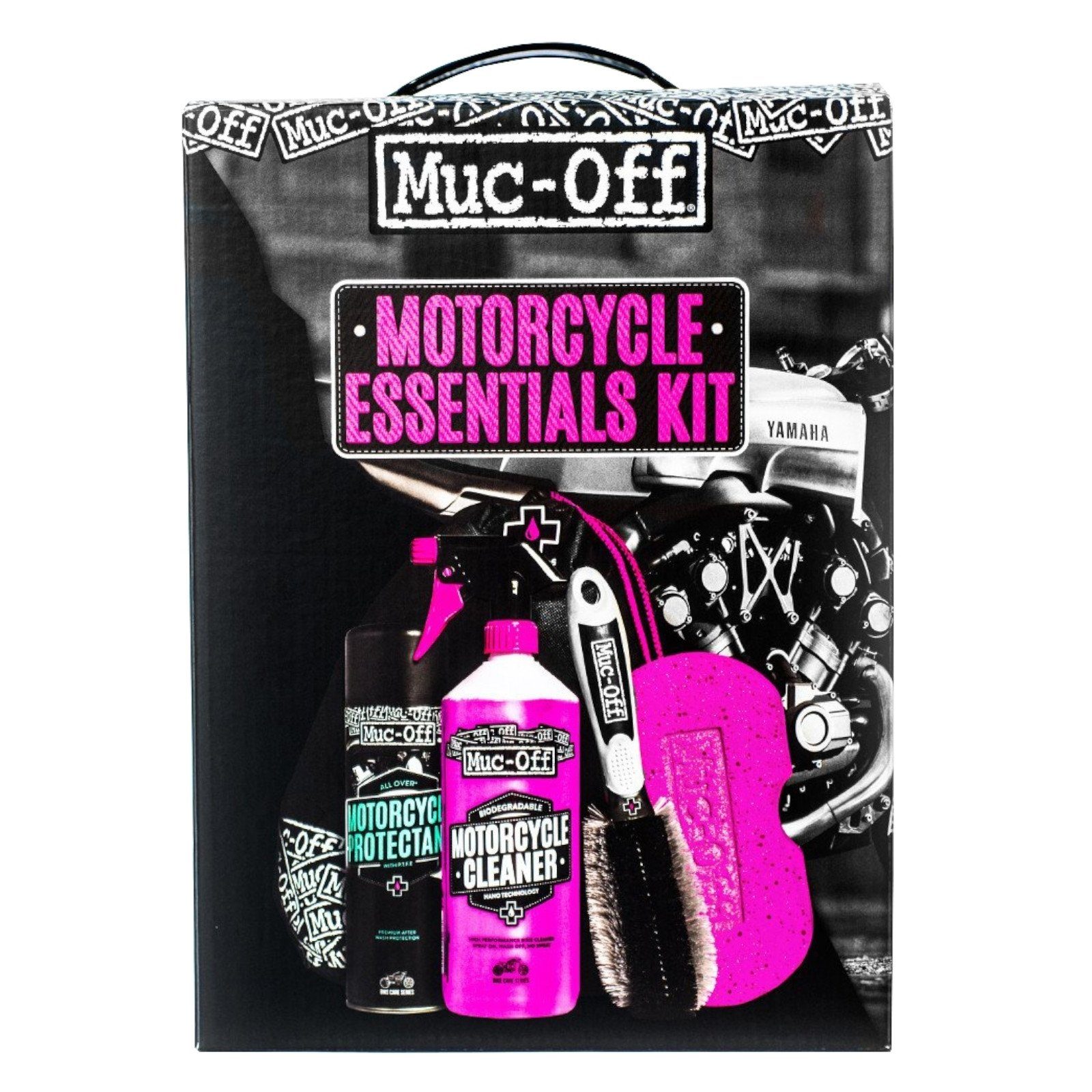 Der Essential Kit von Muc-Off enthält die wichtigsten Pflegemittel für die ganzheitliche Motorradpflege. Der Nano Tech Motorcycle Cleaner reinigt und entfernt Schmutz, während das Motorcycle Protect Spray auf sauberem Rahmen und allen Plastik-, Metall- und Carbonoberflächen einen dünnen Schutzfilm hinterlässt. Der Schwamm und die Bürste runden das Paket ab.