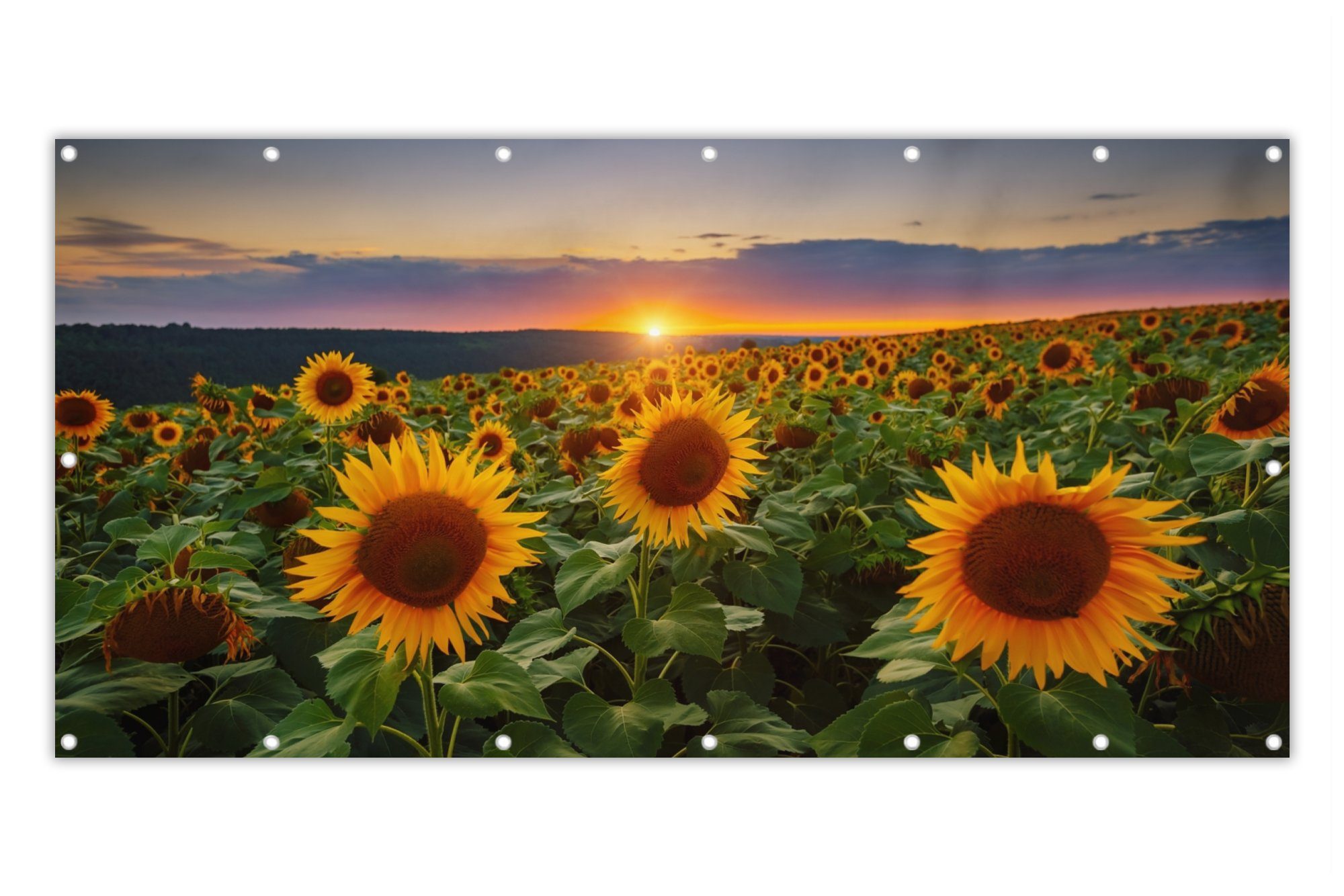 Die Sonne geht über einem Sonnenblumenfeld unter.