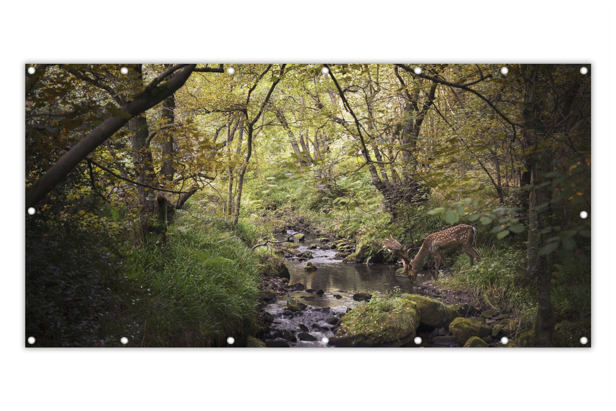 Ein Rendering eines Rehs, das aus einem kleinen Bach im Wald trinkt.