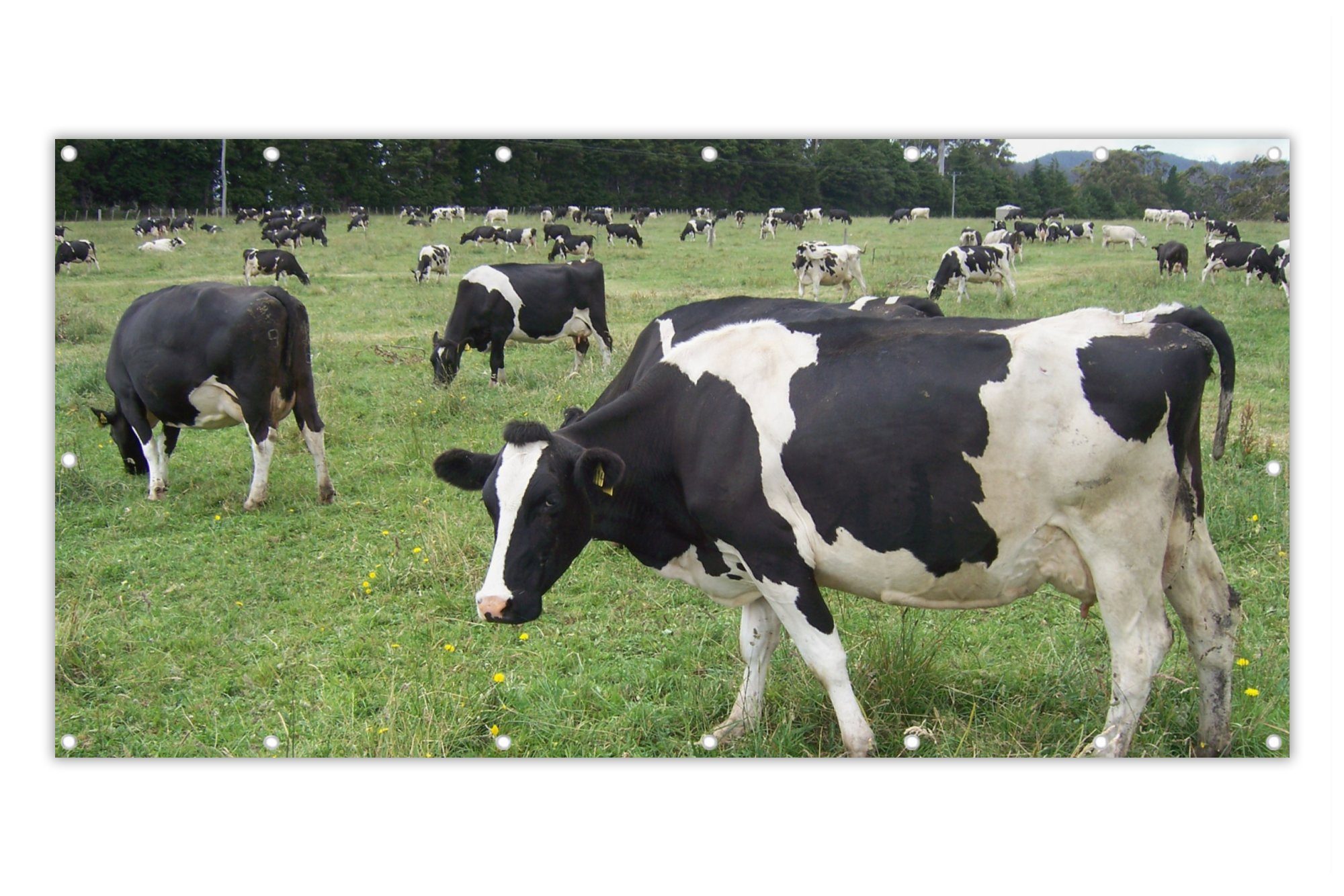 Eine Herde schwarz-weißer Kühe steht auf einer Blumenwiese in der Nähe eines Waldes.