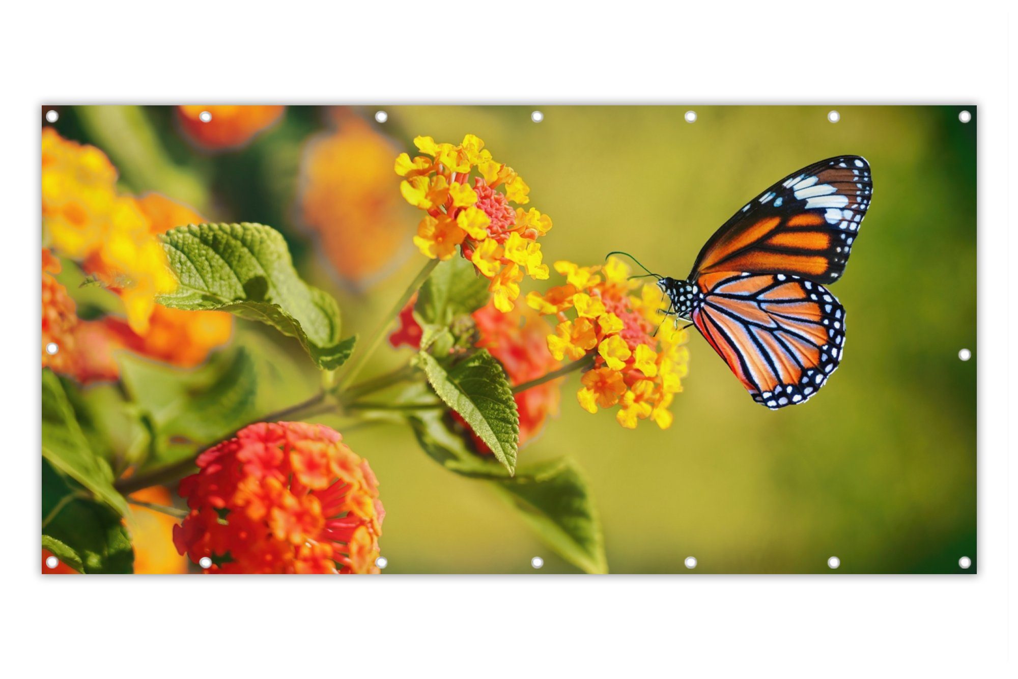Ein orangefarbener Schmetterling sitzt auf einer orangefarbenen Blume.