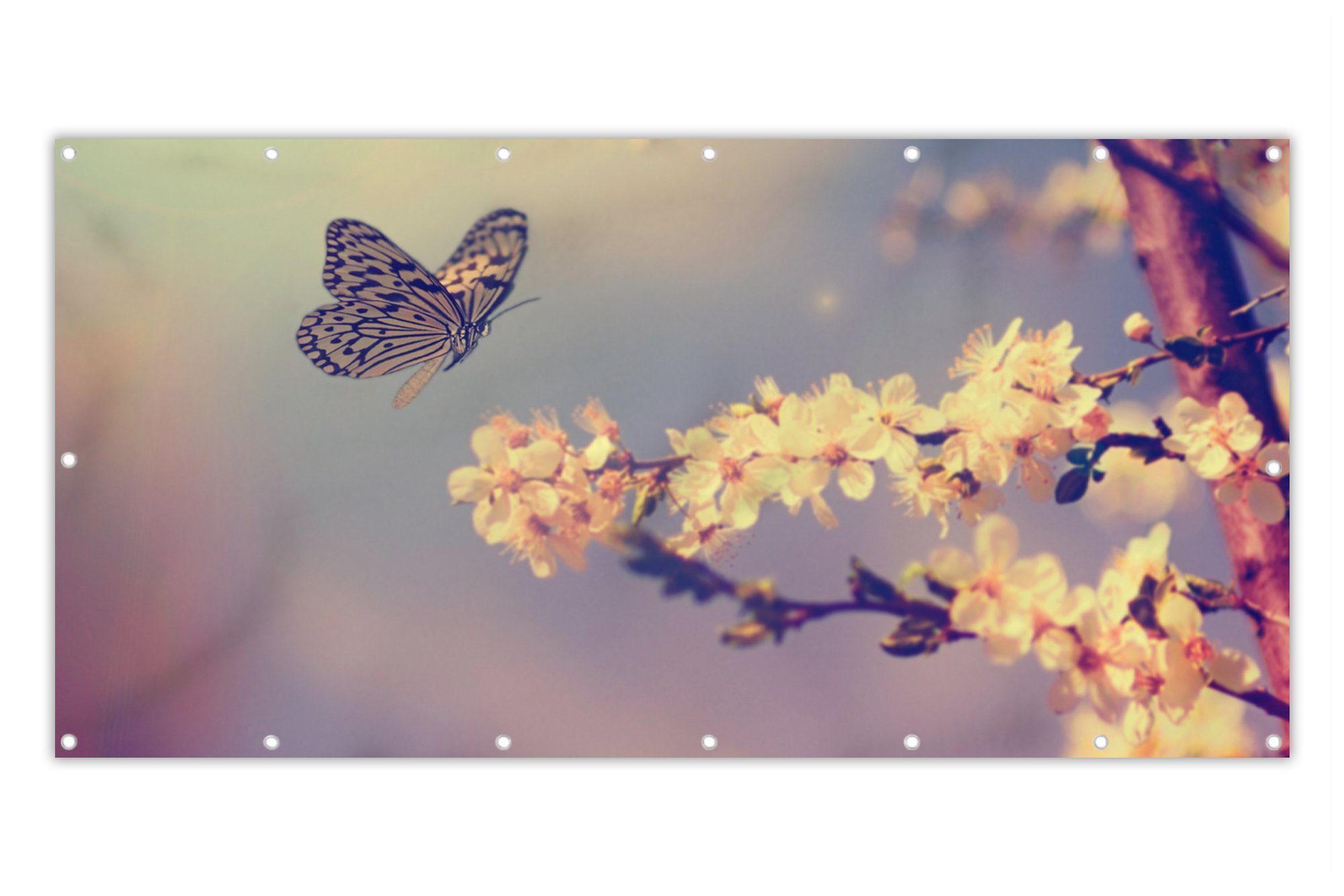 Schmetterling fliegt auf einem Zweig mit weißen Blüten.