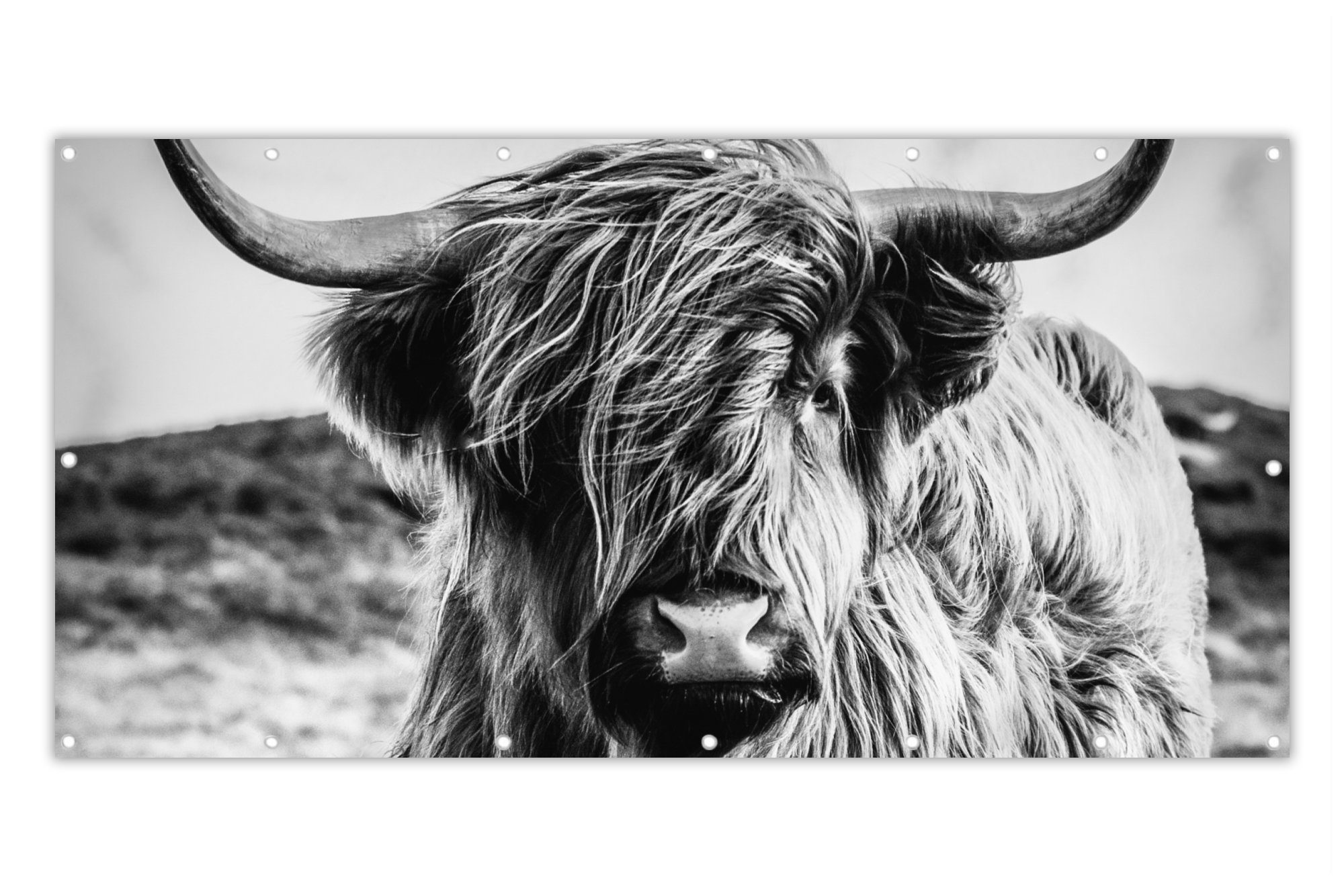 Schwarz-Weiß-Bild eines schottischen Hochlandbewohners in einem Naturschutzgebiet.