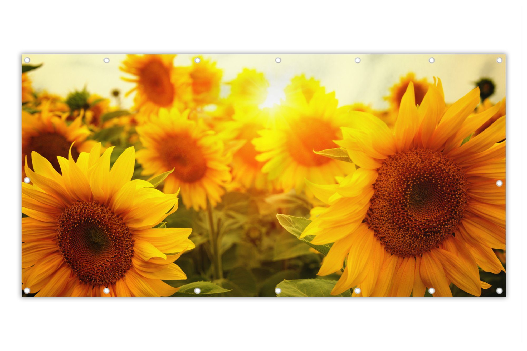 Die Sonne beleuchtet Sonnenblumen in einem Blumenfeld.