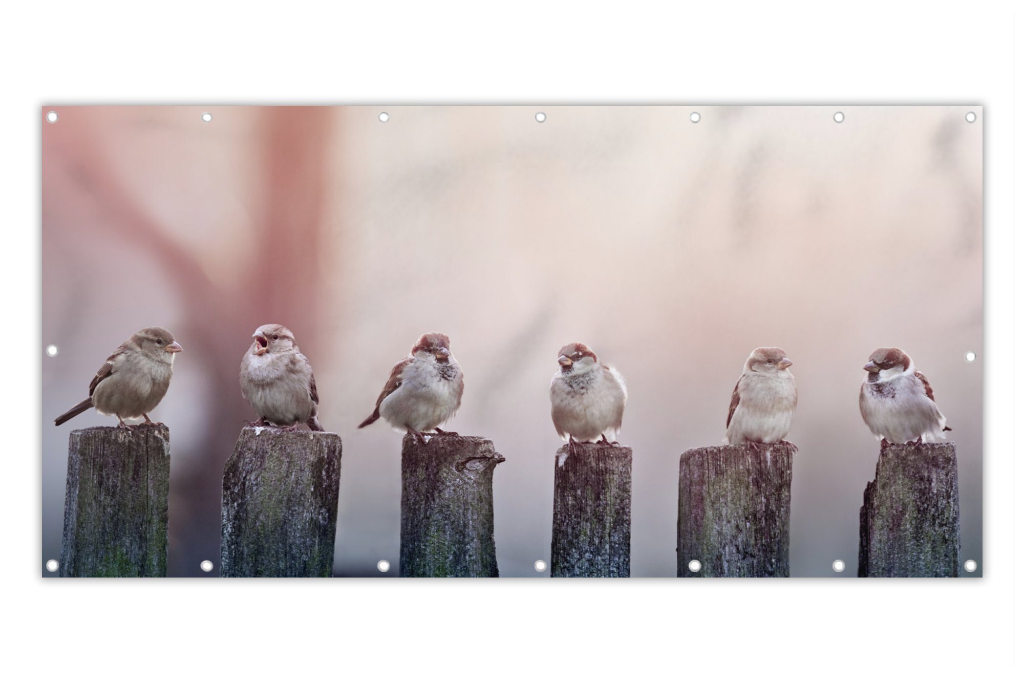 Sechs Spatzen in einer Reihe. Die Vögel sitzen in der Natur auf Holzpfählen.