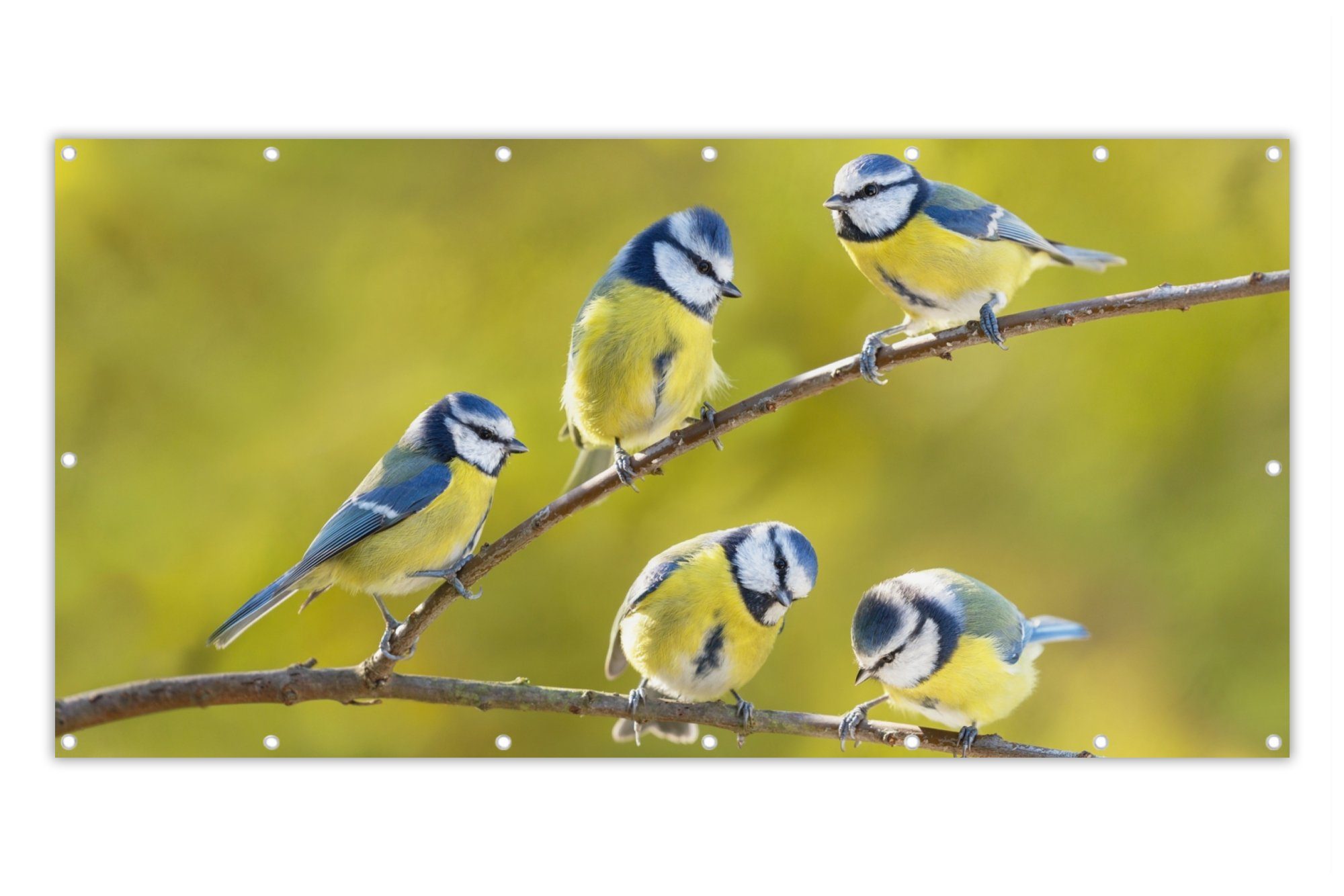Fünf Blaumeisen auf einem Ast.