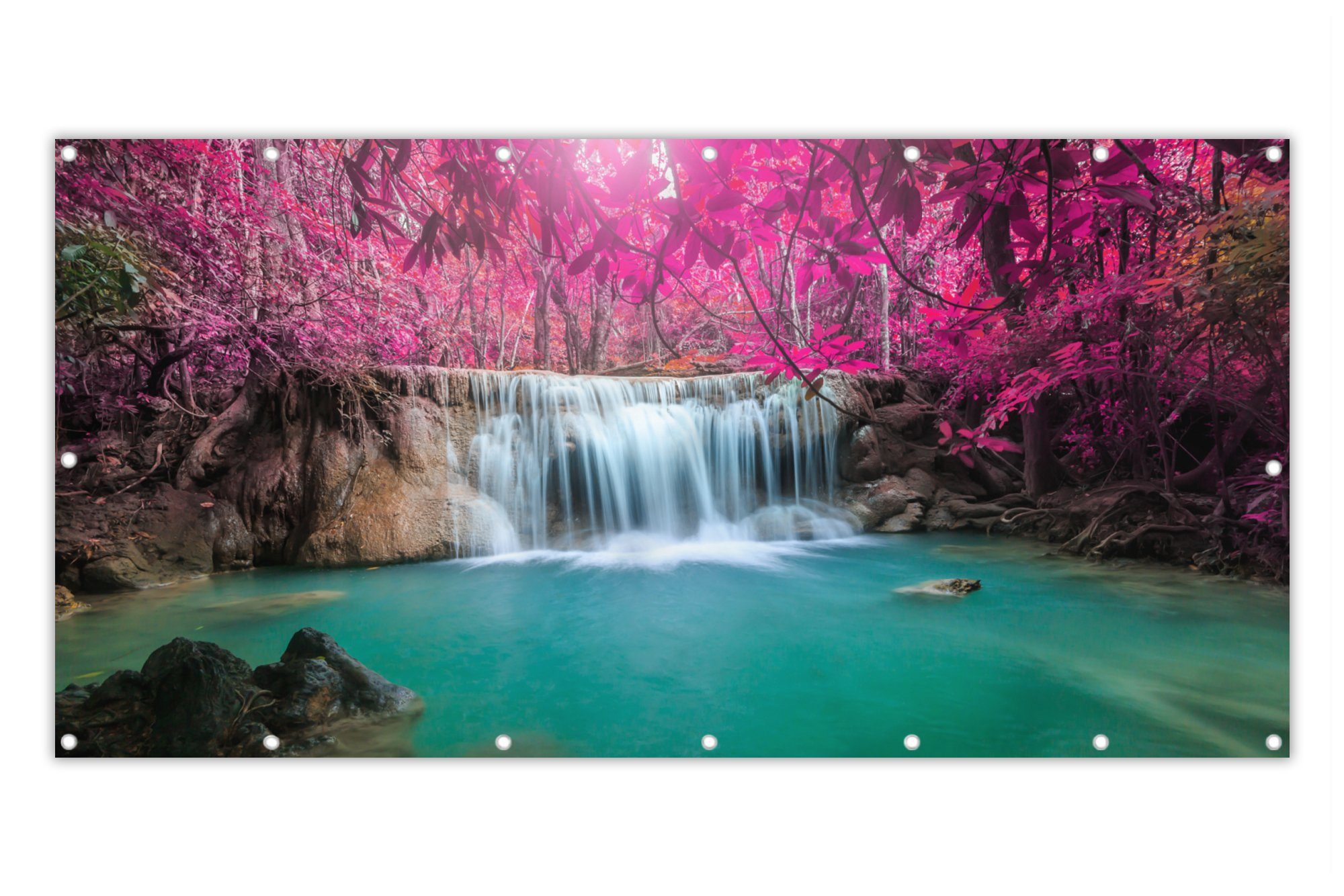 Ein Wasserfall unter einem Baum mit rosa Blättern.