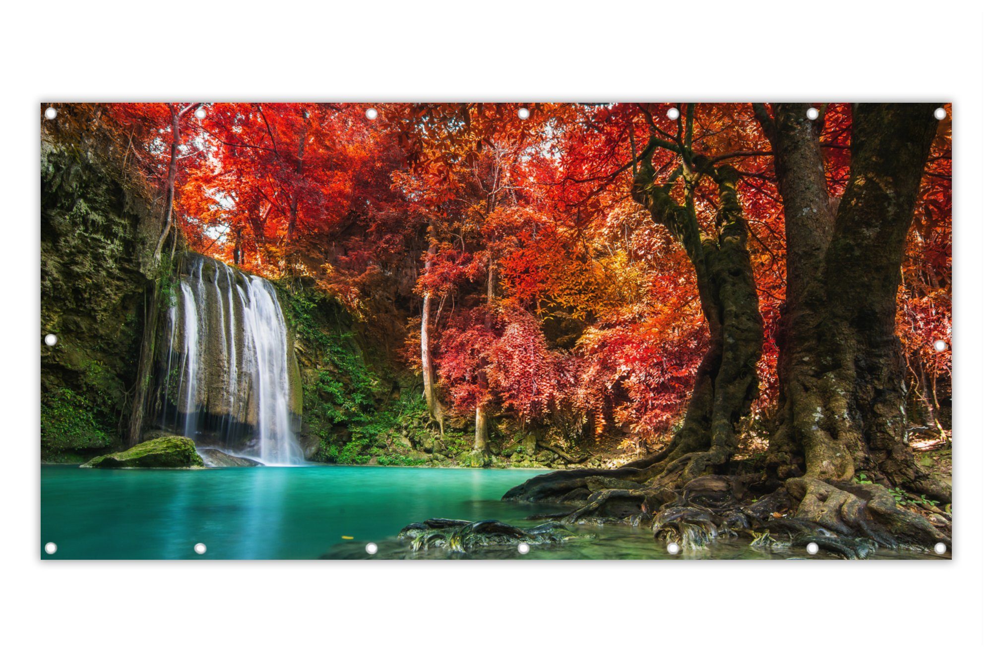 Ein Wasserfall neben einem großen Baum mit roten Blättern.