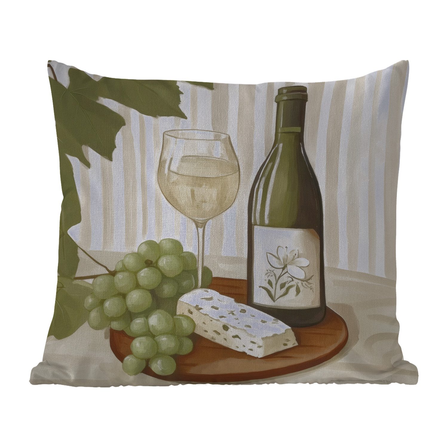 Eine Flasche Weißwein, ein gefülltes Glas, grüne Weintrauben und ein Stück Blauschimmelkäse auf einem Holzbrett mit Blättern im Hintergrund.
