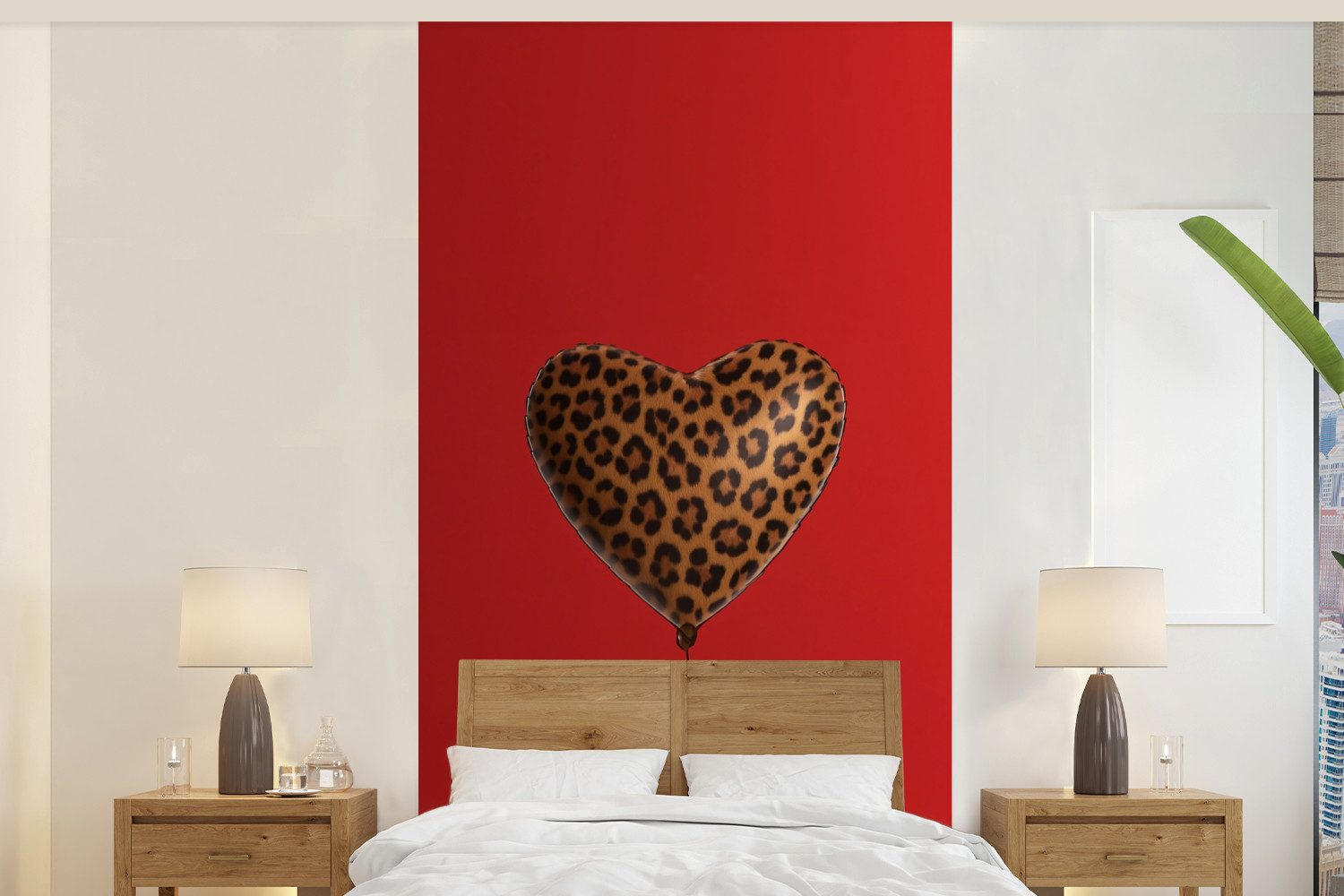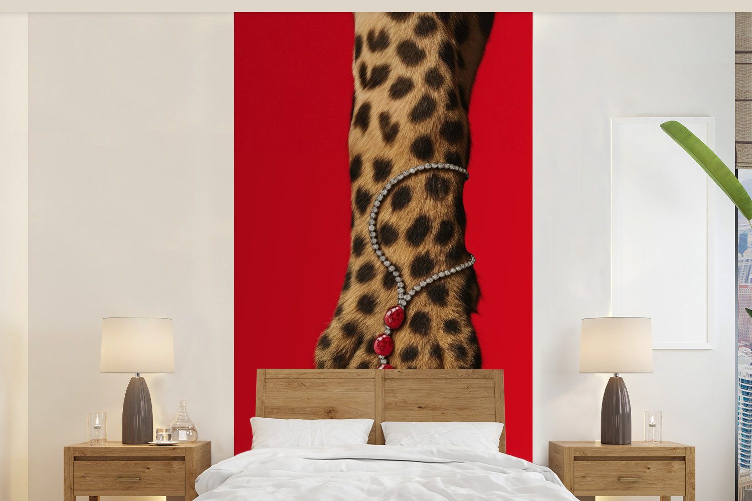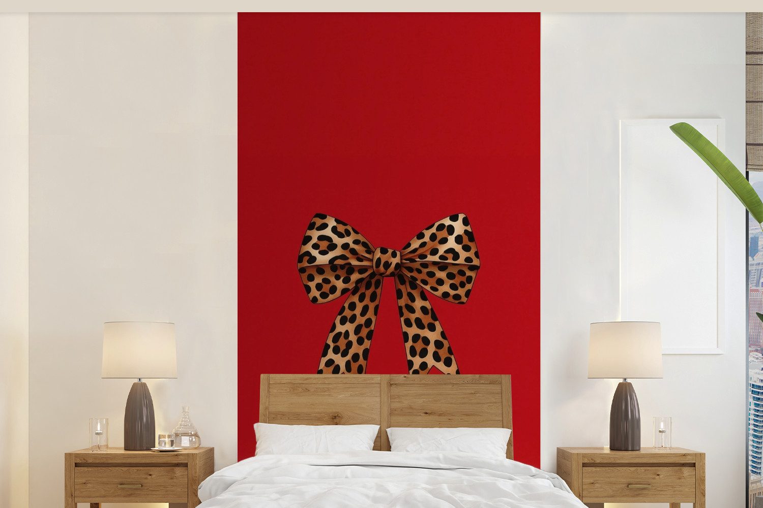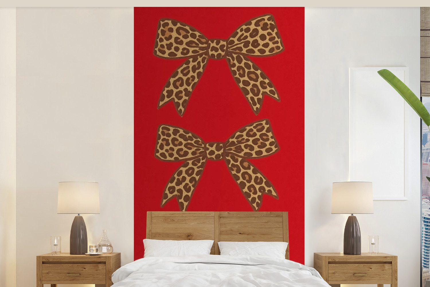 Vor einem einfarbigen roten Hintergrund hängen drei identische Schleifen mit Leopardenmuster vertikal untereinander, gleichmäßig verteilt und perfekt zentriert.Oberflächenstruktur | Matt |