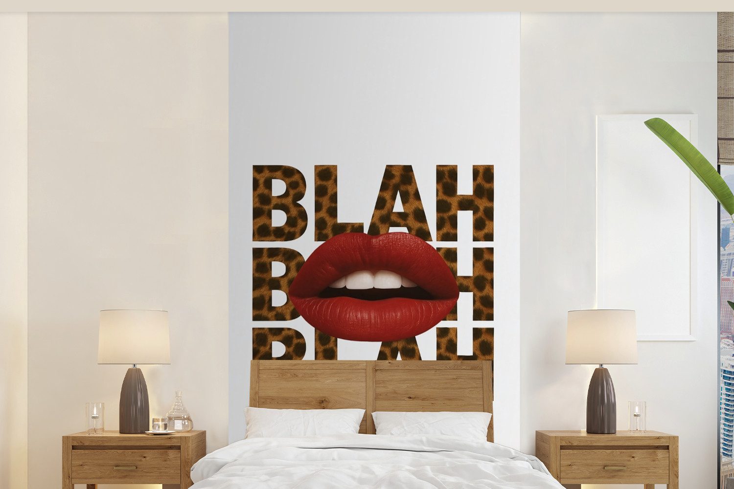 Rote Lippen mit sichtbaren Zähnen sind vor den Worten "BLAH BLAH BLAH" in Pantherbuchstaben auf weißem Hintergrund platziert.Oberflächenstruktur | Matt |