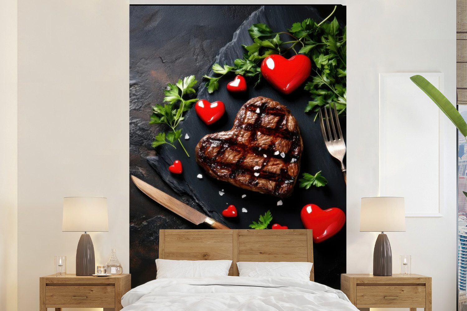 Ein herzförmiges gegrilltes Steak, garniert mit Salzkörnern und frischer Petersilie, umgeben von roten herzförmigen Akzenten, auf einem dunklen Schiefergrund.Oberflächenstruktur | Matt |