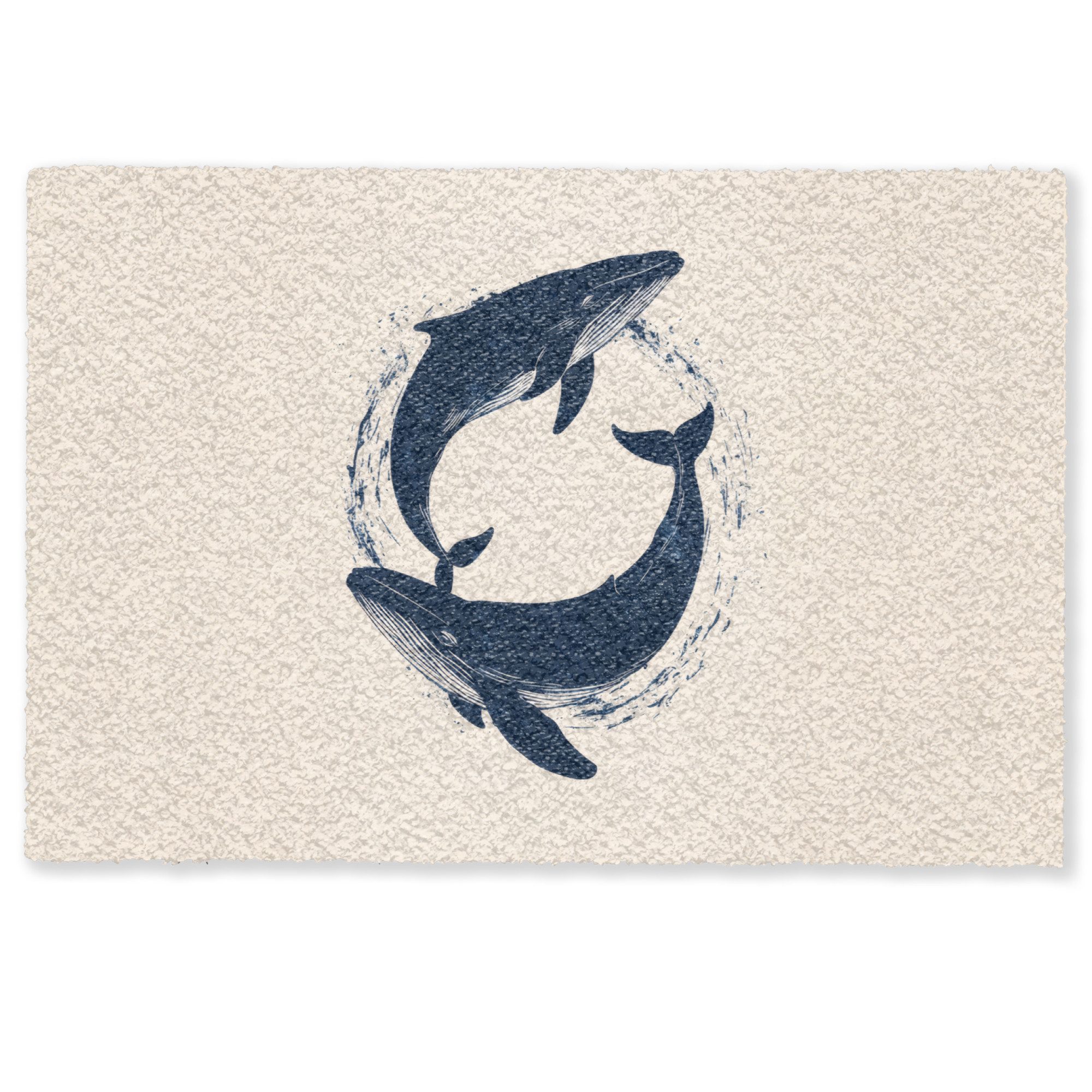 Zwei dunkelblaue Wale drehen sich im Kreis mit Spritzern um sie herum, dargestellt auf einem hellen Hintergrund in einer anmutigen Komposition.Breite | 60 cm |