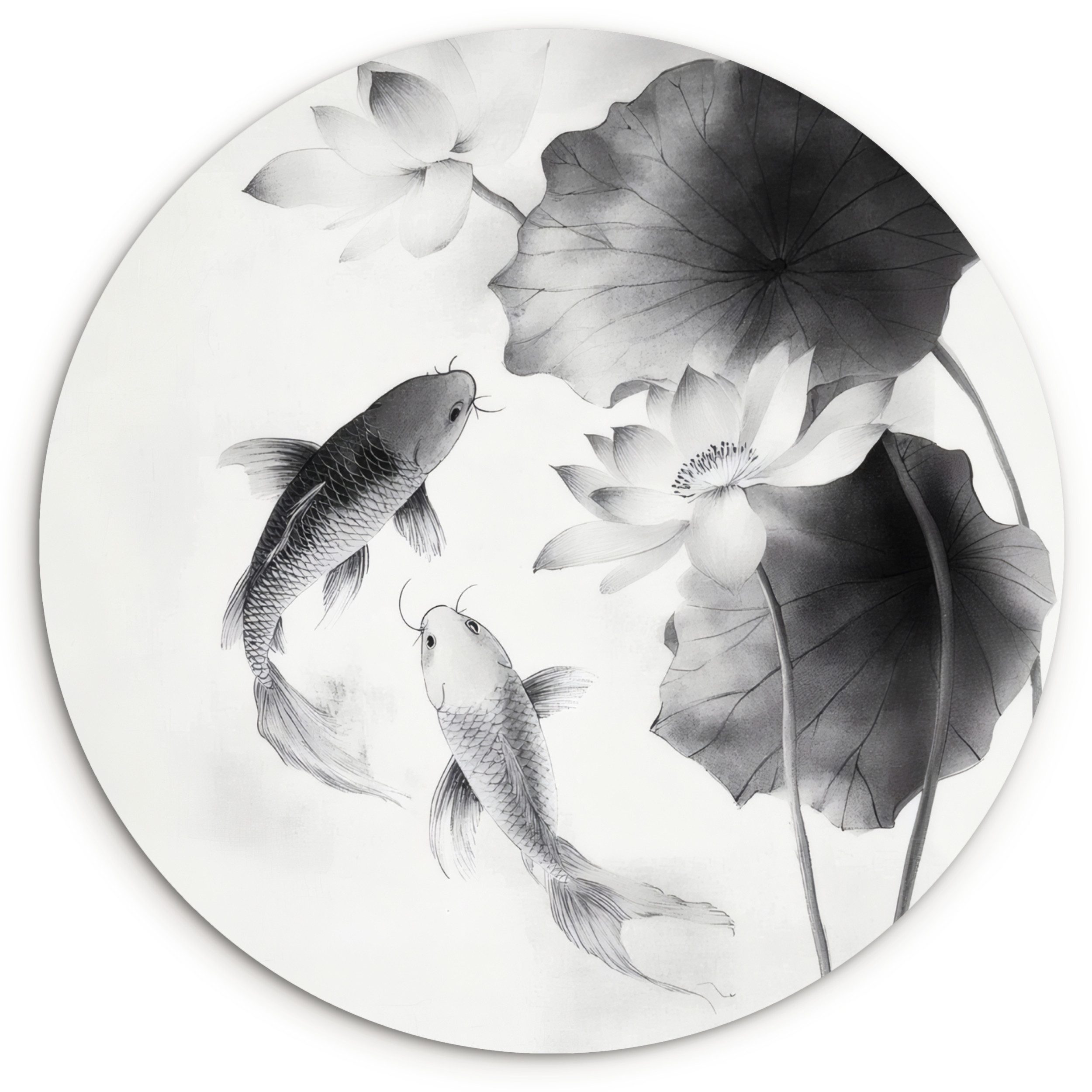 Zwei anmutige Kois schwimmen anmutig neben großen Lotusblumen und Blättern, alles in raffinierten Grautönen gehalten.