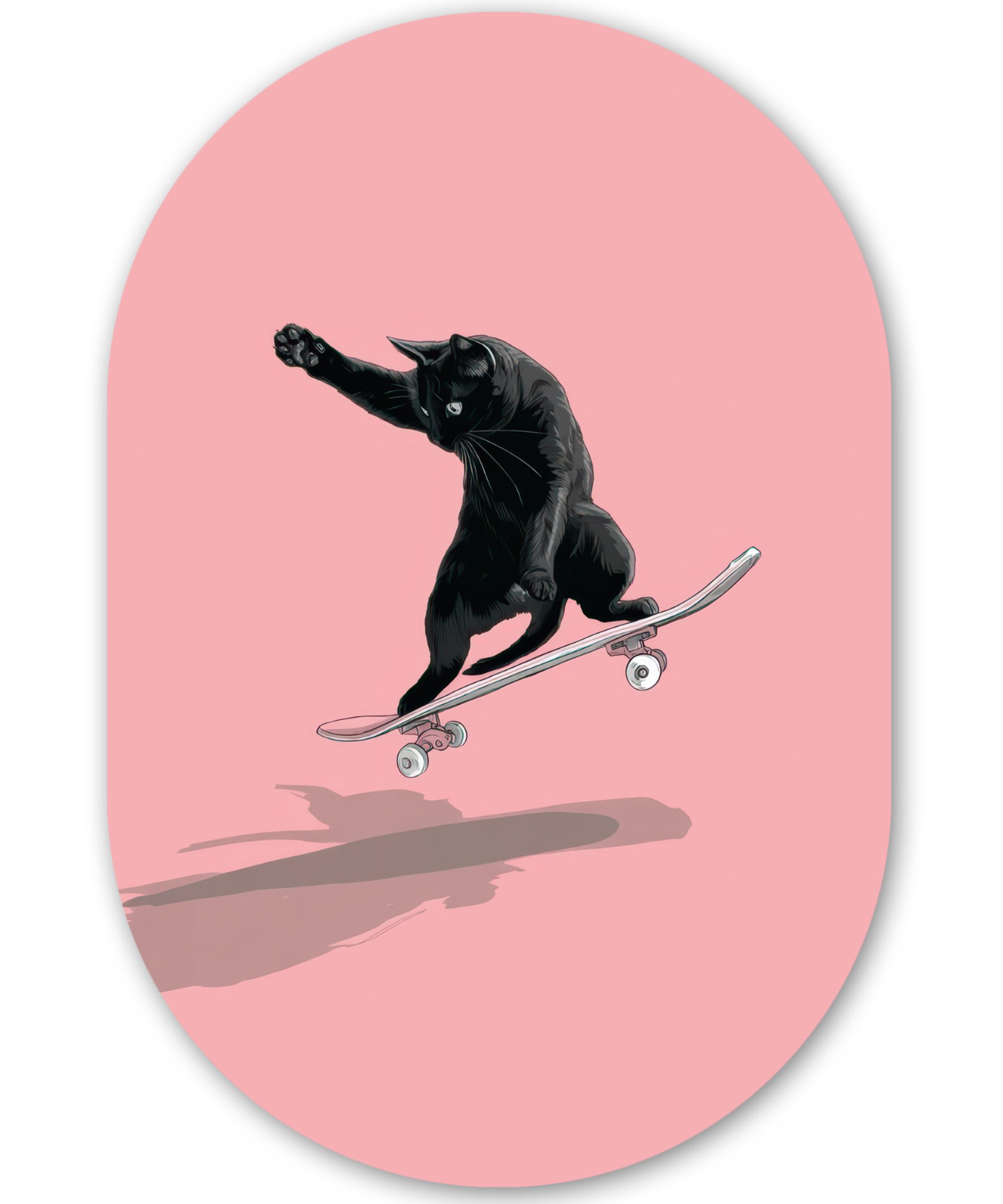 Eine schwarze Katze vollführt einen Sprung auf einem Skateboard vor einem rosa Hintergrund. Ihr Schatten und ihre Körperhaltung strahlen Kraft und Bewegung aus.Kunstgenre | Modern, Natur, Tiere, Abstrakt, Kinderzimmer |
