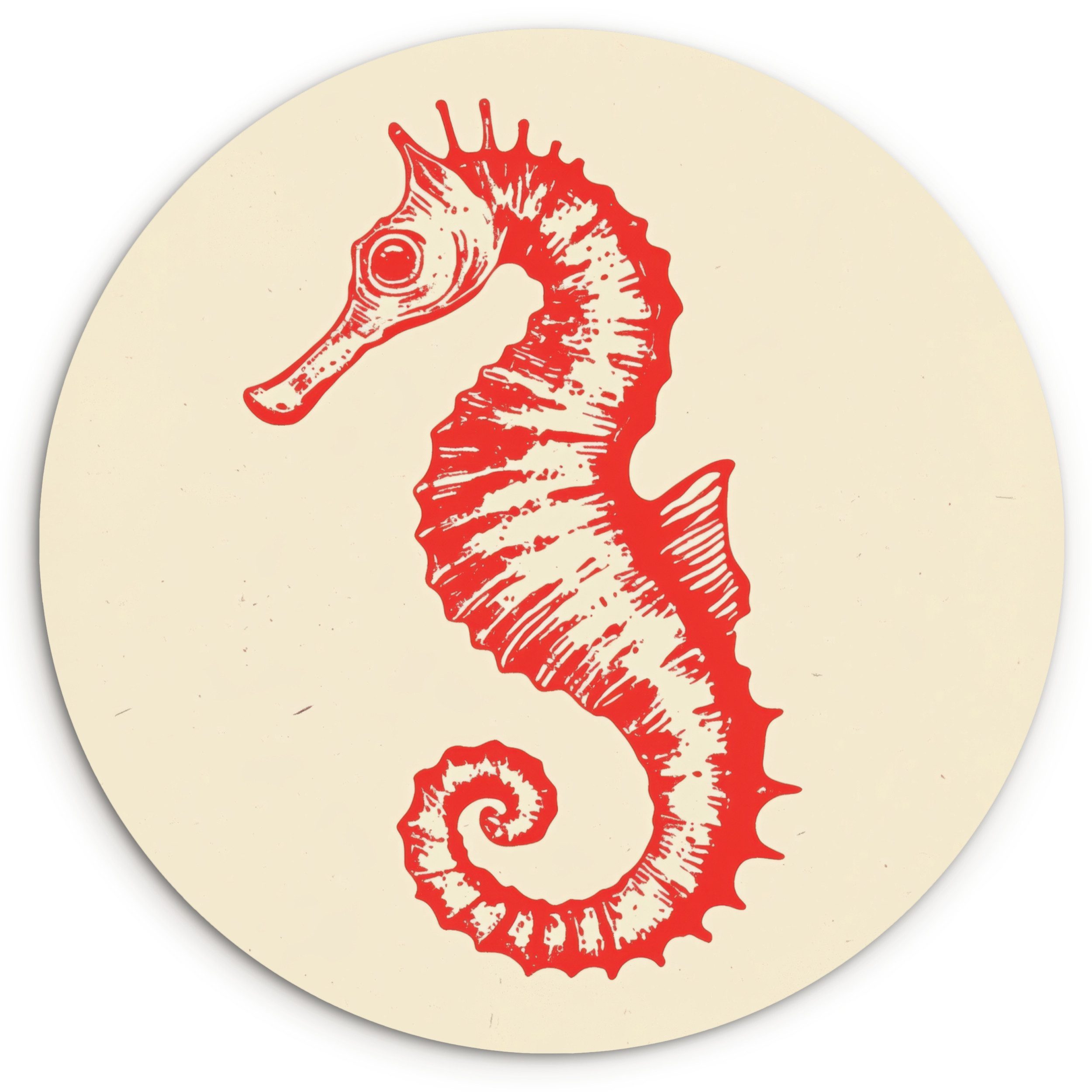 Illustration eines roten Seepferdchens mit feinen Details auf einem beigen Hintergrund.