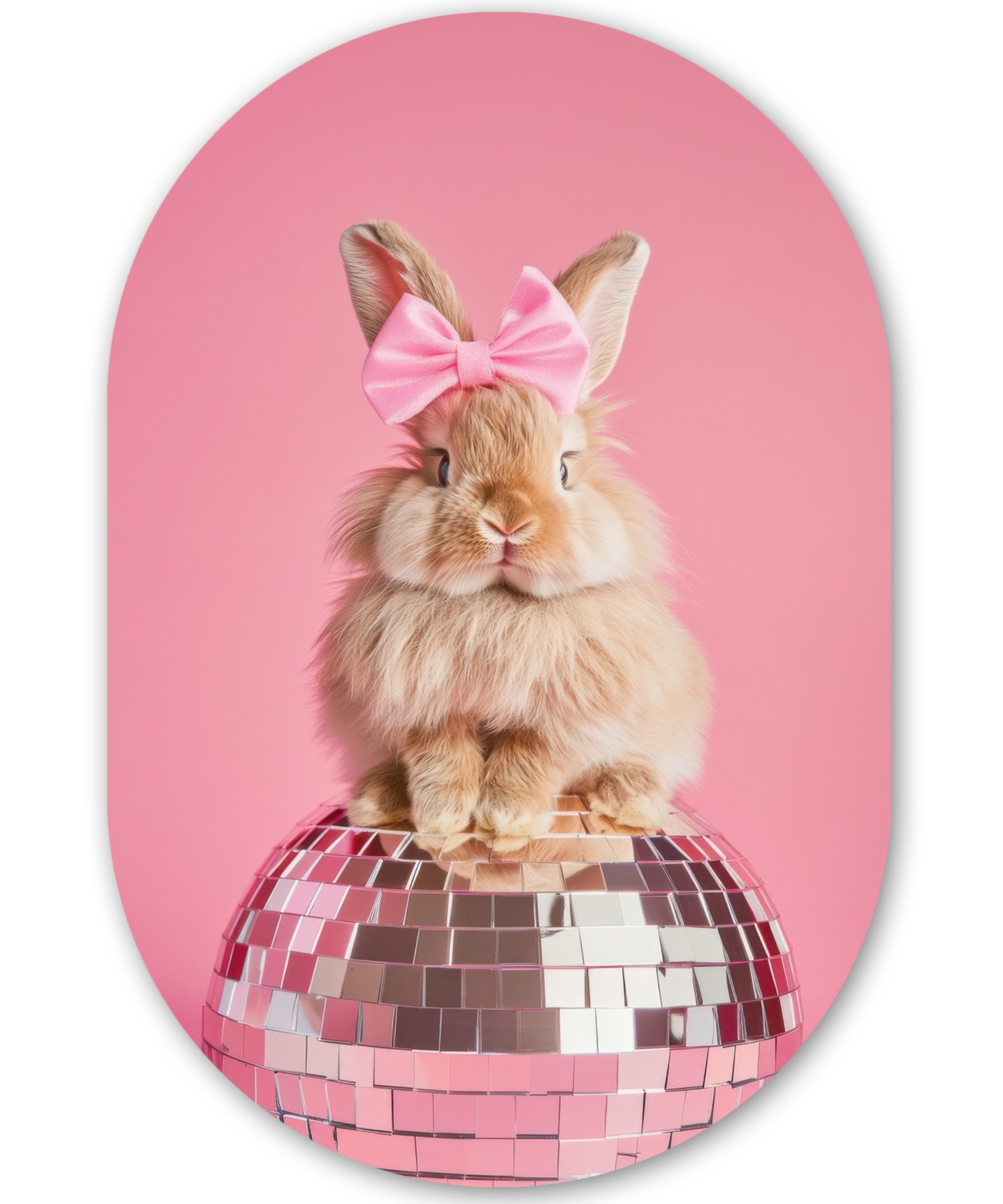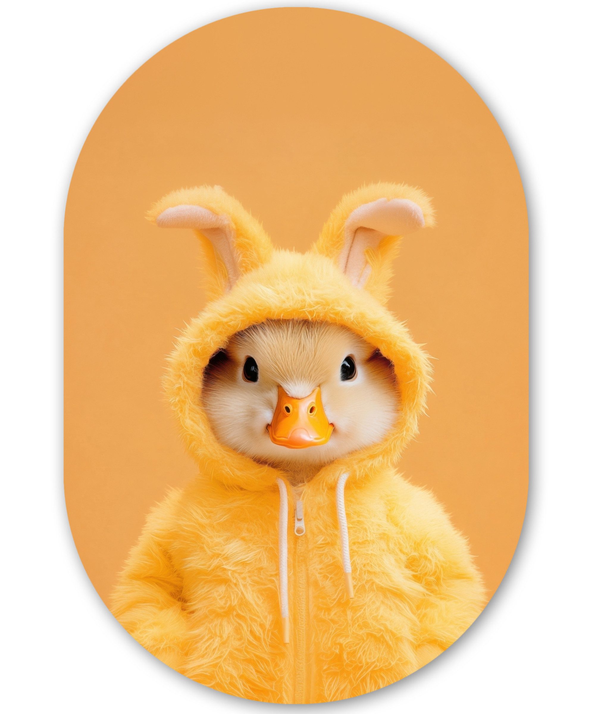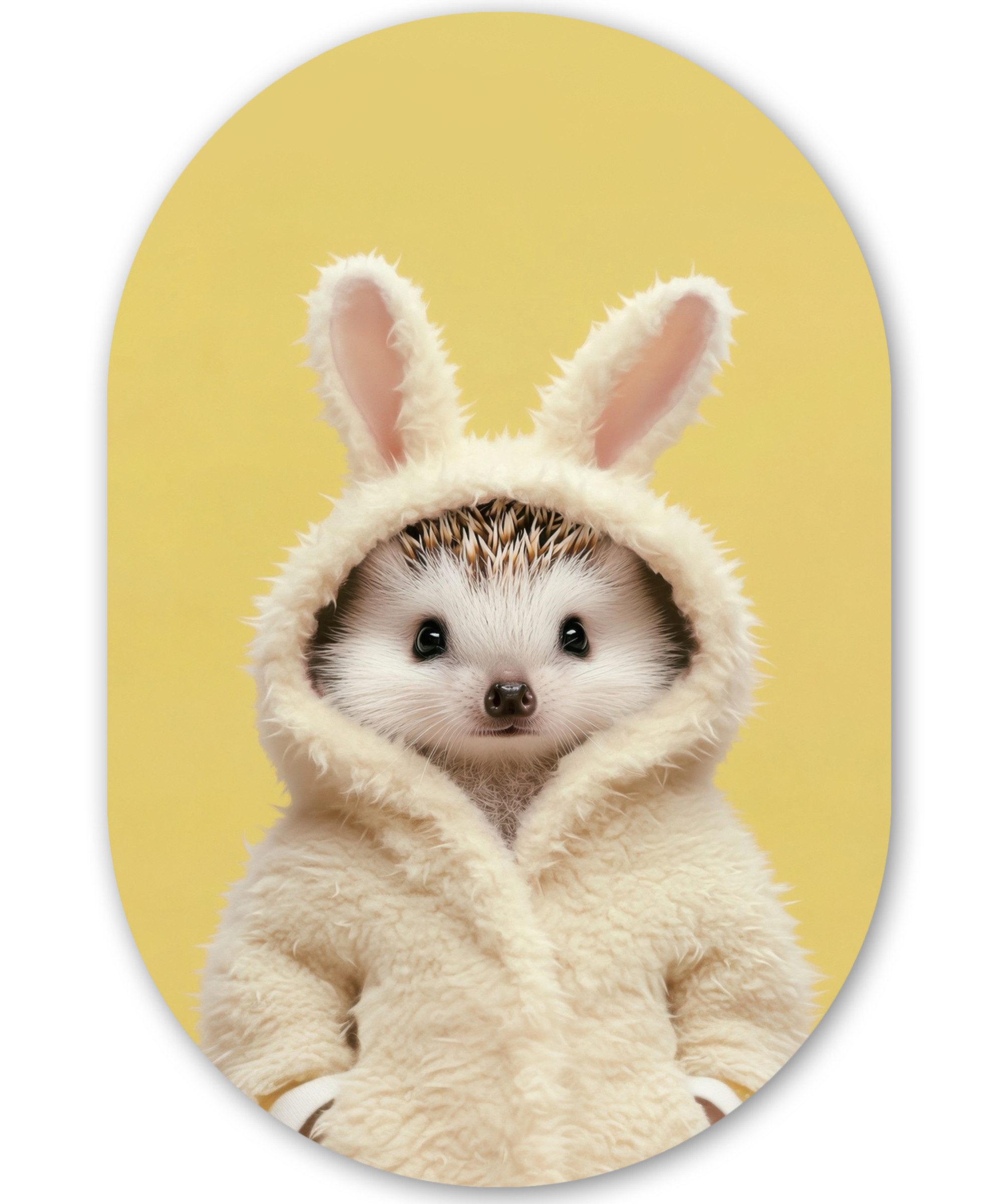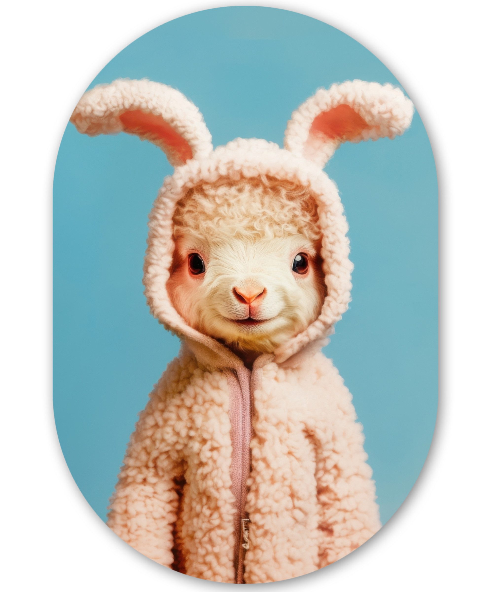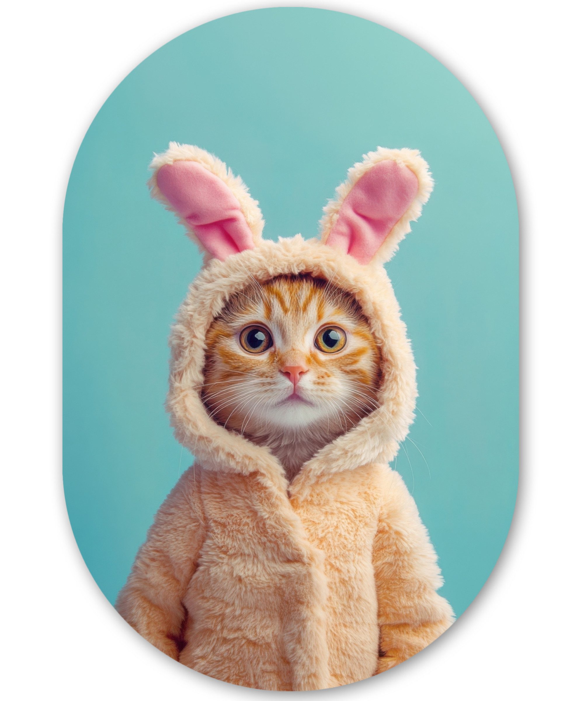 Ein entzückendes rot-weißes Kätzchen trägt einen flauschigen Kapuzenpulli mit Häschenohren. Die großen, neugierigen Augen und der hellblaue Hintergrund machen das Bild verspielt und charmant.Kunstgenre | Modern, Natur, Tiere, Abstrakt, Kinderzimmer |